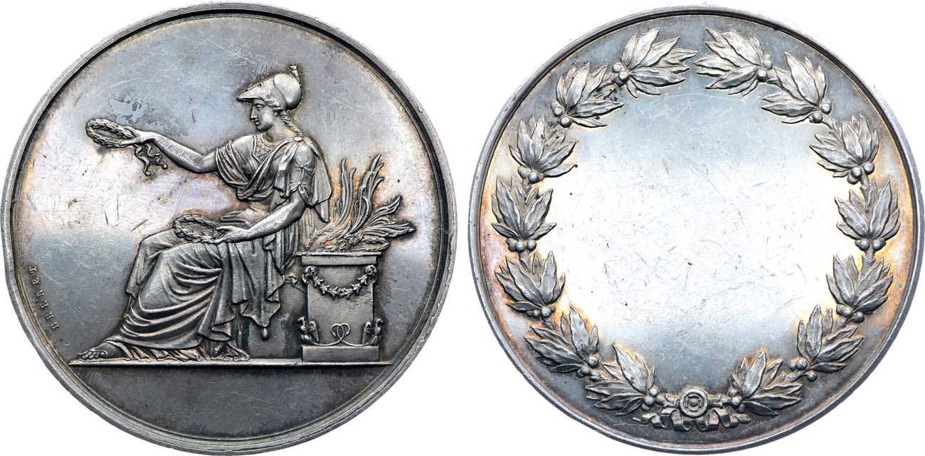 Серебро. 66,66г. Диаметр 51 мм. Парижский монетный двор. Медальер Николя Ги Антуаном Брене (на аверсе слева над линией обреза). Аверс: Женщина, сидящая на колонне, одетая в античном стиле с коринфским шлемом (вероятно, Афина), держит в каждой руке лавровый венок, на колоннах пальмы и короны. Реверс: венок из лавровых листьев. Гурт: "ARGENT". UNC.