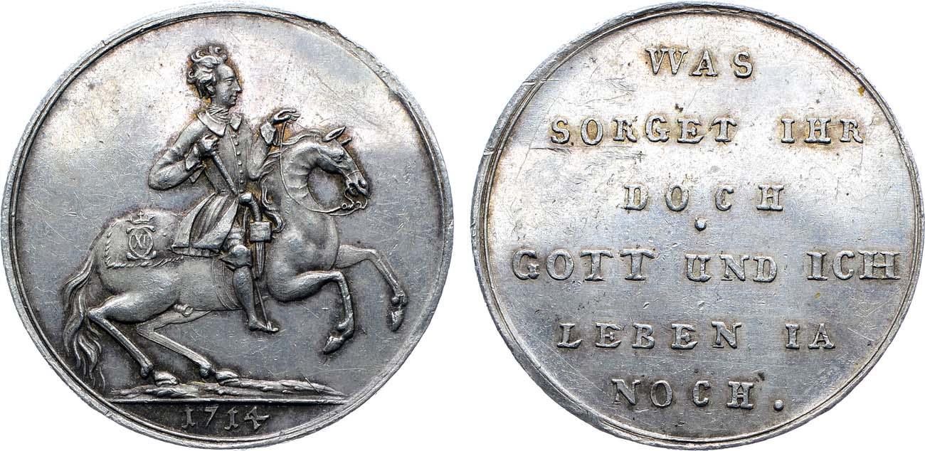 Серебро. 7,25г. Диаметр 31 мм. Без подписи медальера. Аверс: Карл XII верхом на гарцующей лошади вправо, под линией обреза дата "1714". Реверс: текст в 6 строк: "was/ sorget ihr/ doch/, gott und ich/ leben ia/ noch". AU.