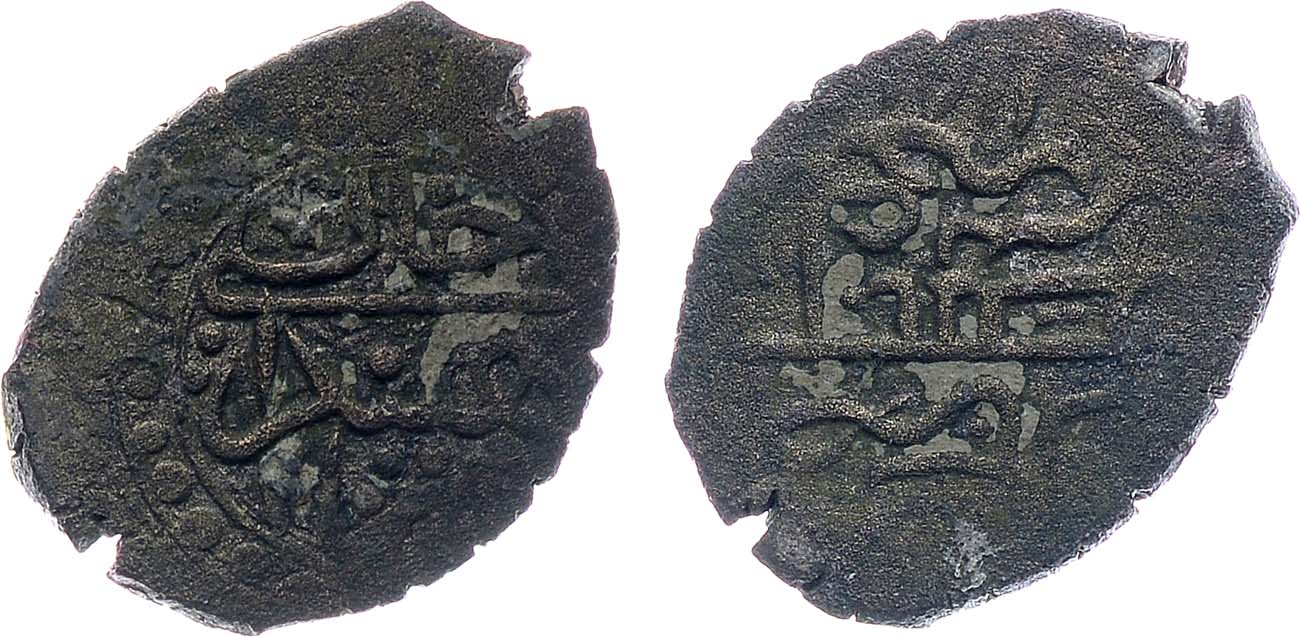 Биллон. 1,36г. Бахчисарайский монетный двор. Аверс: "хан-хин гирей-ша". Реверс: тамга в центре, линия соединена с тамгой. Гурт гладкий. Сариев 178. AU/UNC.