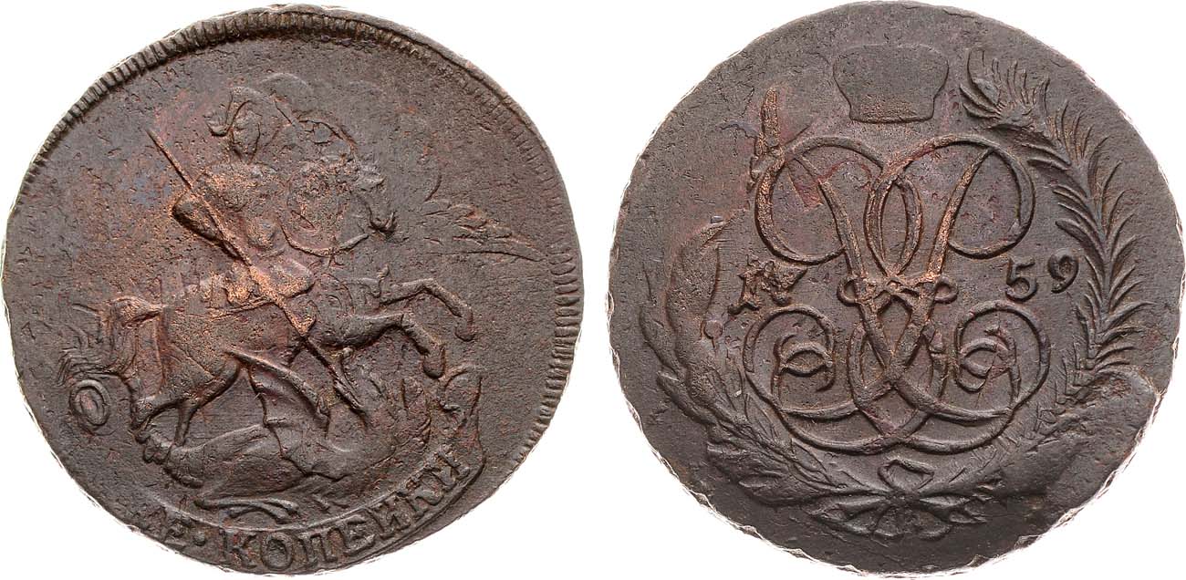 Медь. 20,5г. Аверс: номинал под московским гербом. Гурт сетчатый. Перечекан из 1 копейки образца 1755 года. Уздеников 2596. Биткин 472. Дьяков 135, 532. Brekke 92, 102. AU.
