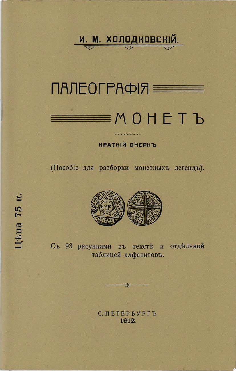 СПБ, 1912 г. Репринт 2010 года. Тираж репринта 500 экз. Пособие для разборки монетных легенд посвящено особенностям шрифтового оформления монет с древних времен и до конца ХIX века. Содержит 93 иллюстрации и шрифторые таблицы.