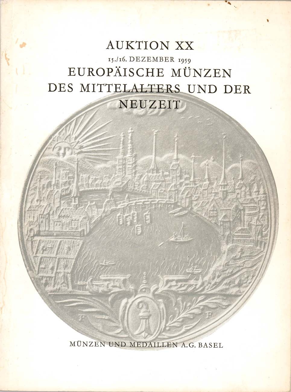 Базель, 15-16 декабря 1959 г. 72 стр., 48 табл. илл. 205 лотов русских монет. Представлена большая подборка редких ранних серебряных монет периода Петра I. Кроме этого: рубль Лжедмитрия, новодел пробных 5 рублей 1755, 5 рублей 1832 "из россыпей Колыванских", 25 рублей 1876, 2 1/2 империала 1896 и 1908 гг.