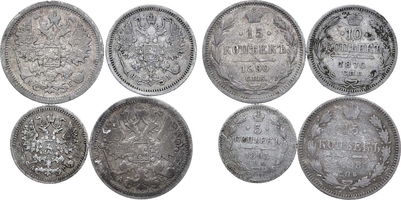 Серебро. 15 копеек 1898 года. СПБ-АГ. Серебро. 2,27 г. Уздеников 2093. Биткин 148. Казаков 122. F/VF. 15 копеек 1890 года. СПБ-АГ. Серебро. 2,58 г. Уздеников 2038. Биткин 123. Казаков 727. VF. 10 копеек 1876 года. СПБ-HI. Серебро. 1,61 г. Уздеников 1917. Биткин 260. XF. 5 копеек 1893 года. СПБ-АГ. Серебро. 0,8 г. Уздеников 2058. Биткин 153. Казаков 784. F/VF.