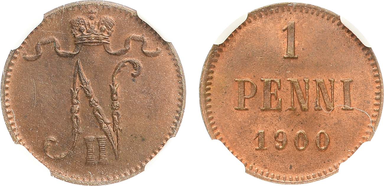 Медь. Для Финляндии. Гельсингфорсский монетный двор. Уздеников 4764. Биткин 461. Казаков 219. MS 64 BN.