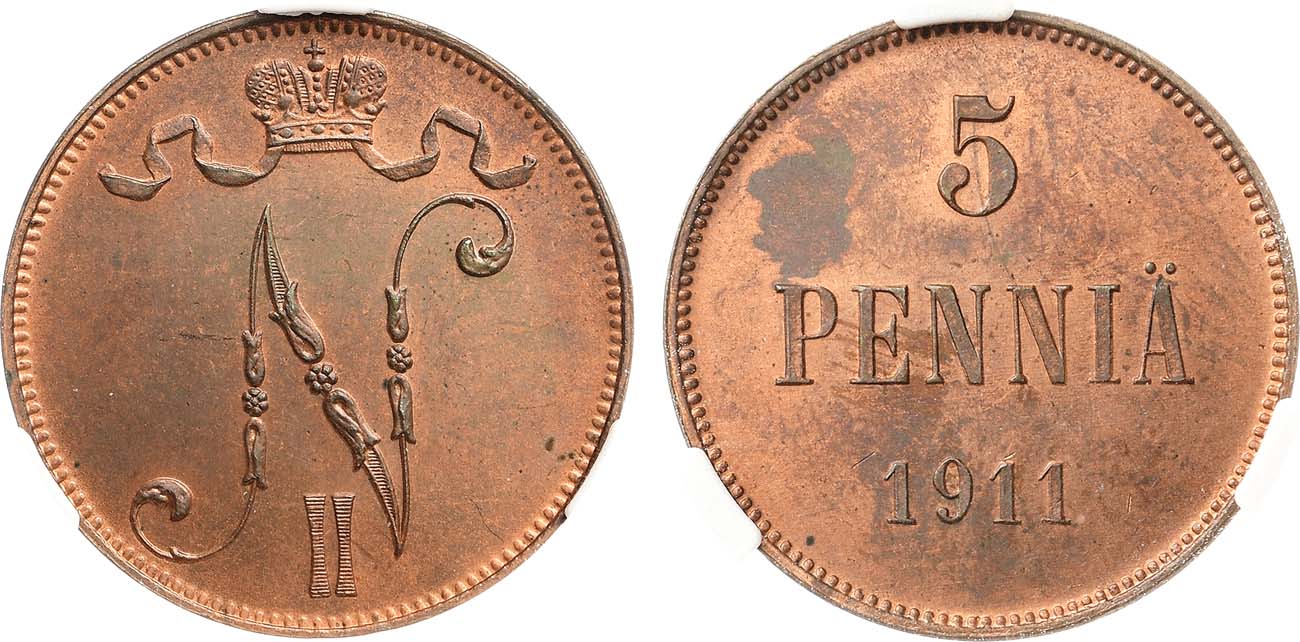 Медь. Для Финляндии. Гельсингфорсский монетный двор. Уздеников 4808. Биткин 451. Казаков 357. MS 63 RB.