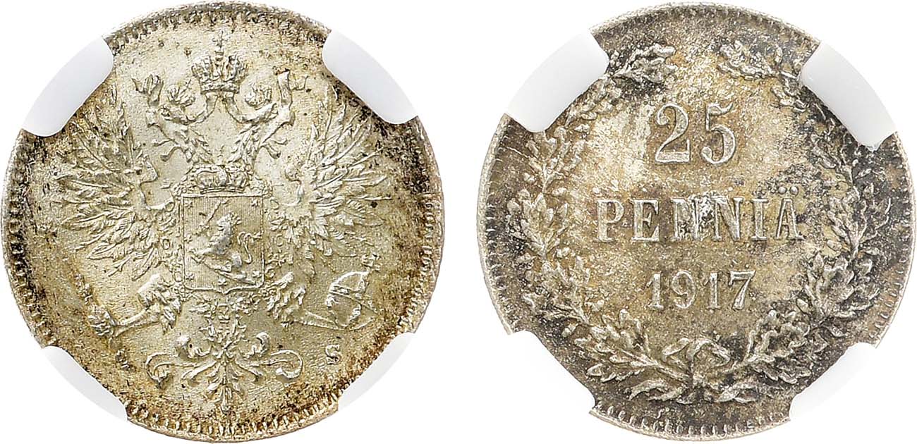 Серебро. Для Финляндии. Гельсингфорсский монетный двор. Аверс: орёл с коронами. Уздеников 4837. Биткин 422. Казаков 538. MS 65.