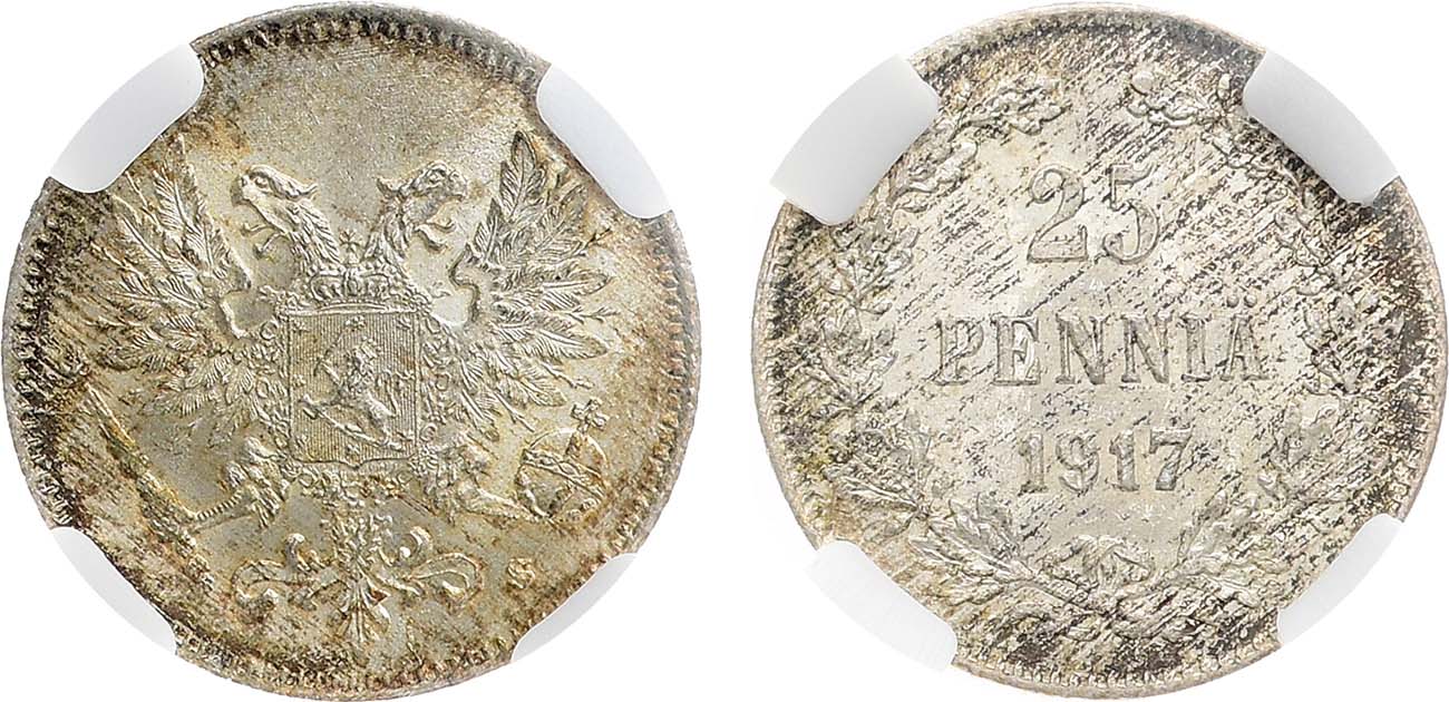 Серебро. Для Финляндии. Гельсингфорсский монетный двор. Аверс: орёл без корон. Уздеников 4838. Биткин 2. Казаков 542. MS 65.