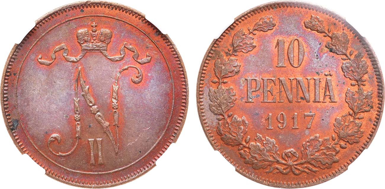 Медь. Для Финляндии. Гельсингфорсский монетный двор. Уздеников 4839. Биткин 440. Казаков 539. MS 63 RB.