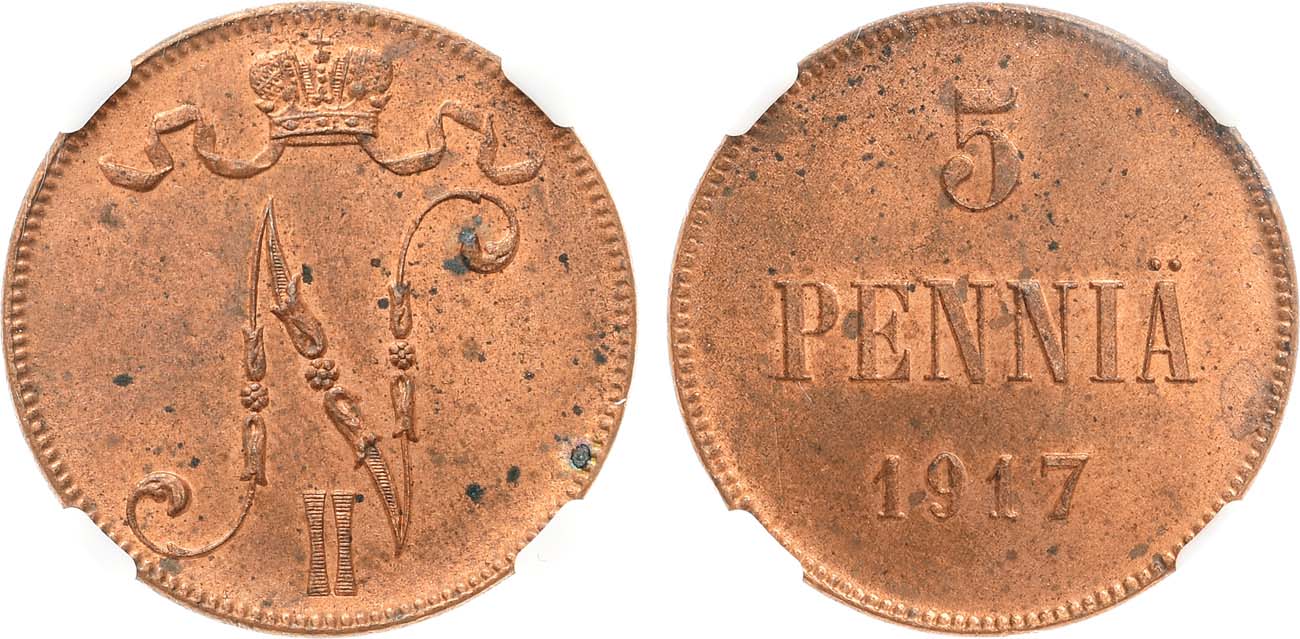 Медь. Для Финляндии. Гельсингфорсский монетный двор. Аверс: вензель с короной. Уздеников 4841. Биткин 457. Казаков 540. MS 63 RB.