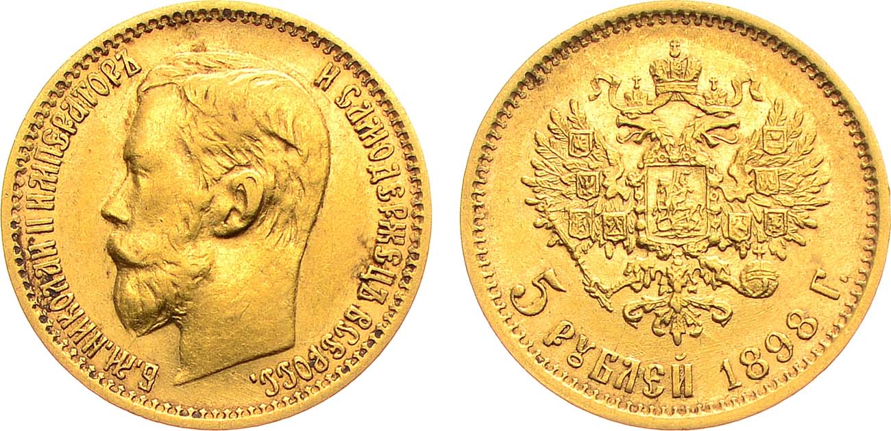 Золото. 4,27г. Аверс: штемпель 1898 года (портрет рельефный, ободок узкий). Уздеников 0329. Биткин 20. Казаков 109. AU.