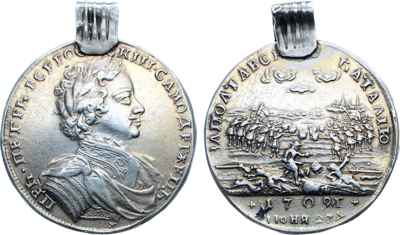 Серебро. 41,02г. Диаметр 42 мм. Москва, Кадашевский монетный двор, начало XVIII в. Медальеры: С. Гуэн (на аверсе в обрезе рукава "GOIN∙F∙"), Г. Хаупт (на реверсе над обрезом: "HAUPT∙"). Припаяно ушко. Биткин 174(R1). Дьяков 27.5(R2). XF.