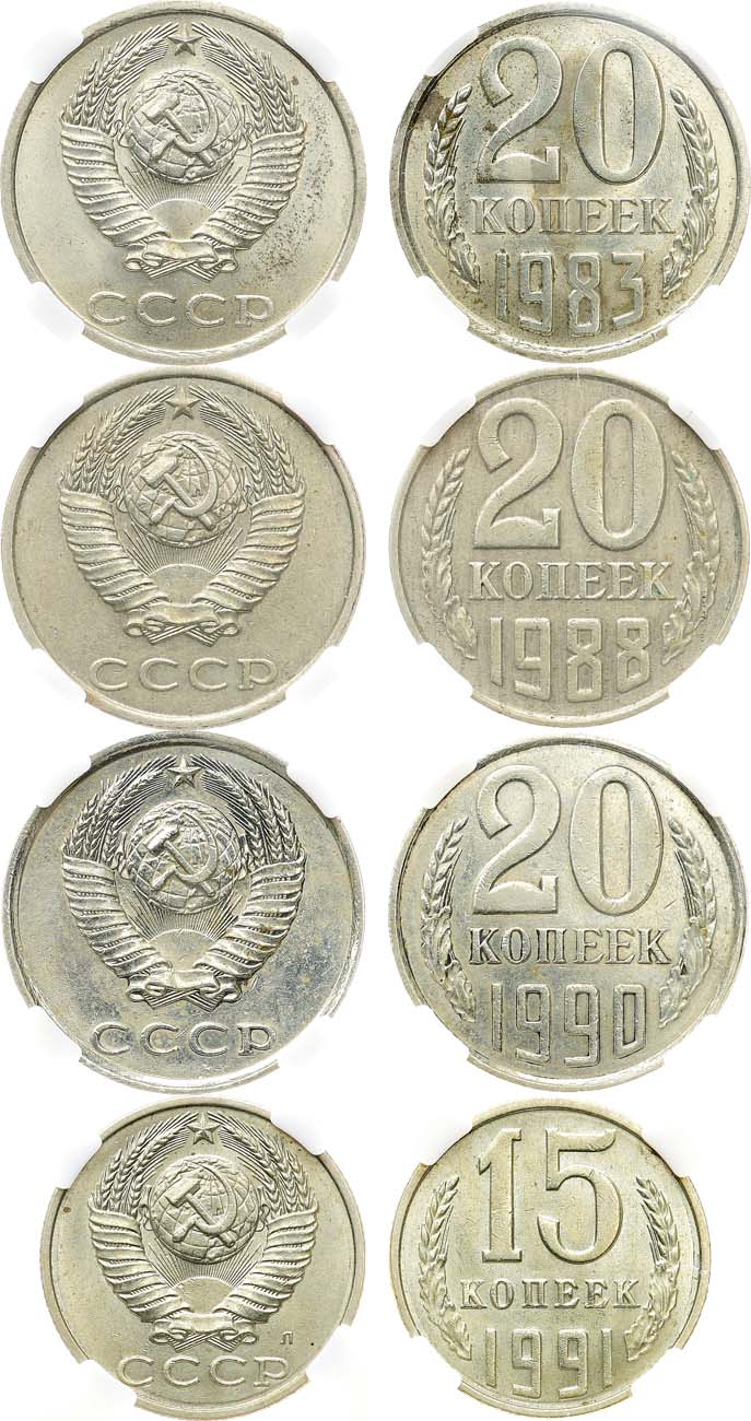 Медно-никелевый сплав. 20 копеек 1983 года. Малый вес. 2,99 г. ННР UNC det. 20 копеек 1988 года. Большой вес. 3,74 г. ННР AU det. 20 копеек 1990 года. Малый вес. 2,88 г. ННР AU det. 15 копеек 1991 года. Л. Большой вес. 2,75 г. ННР MS 64.