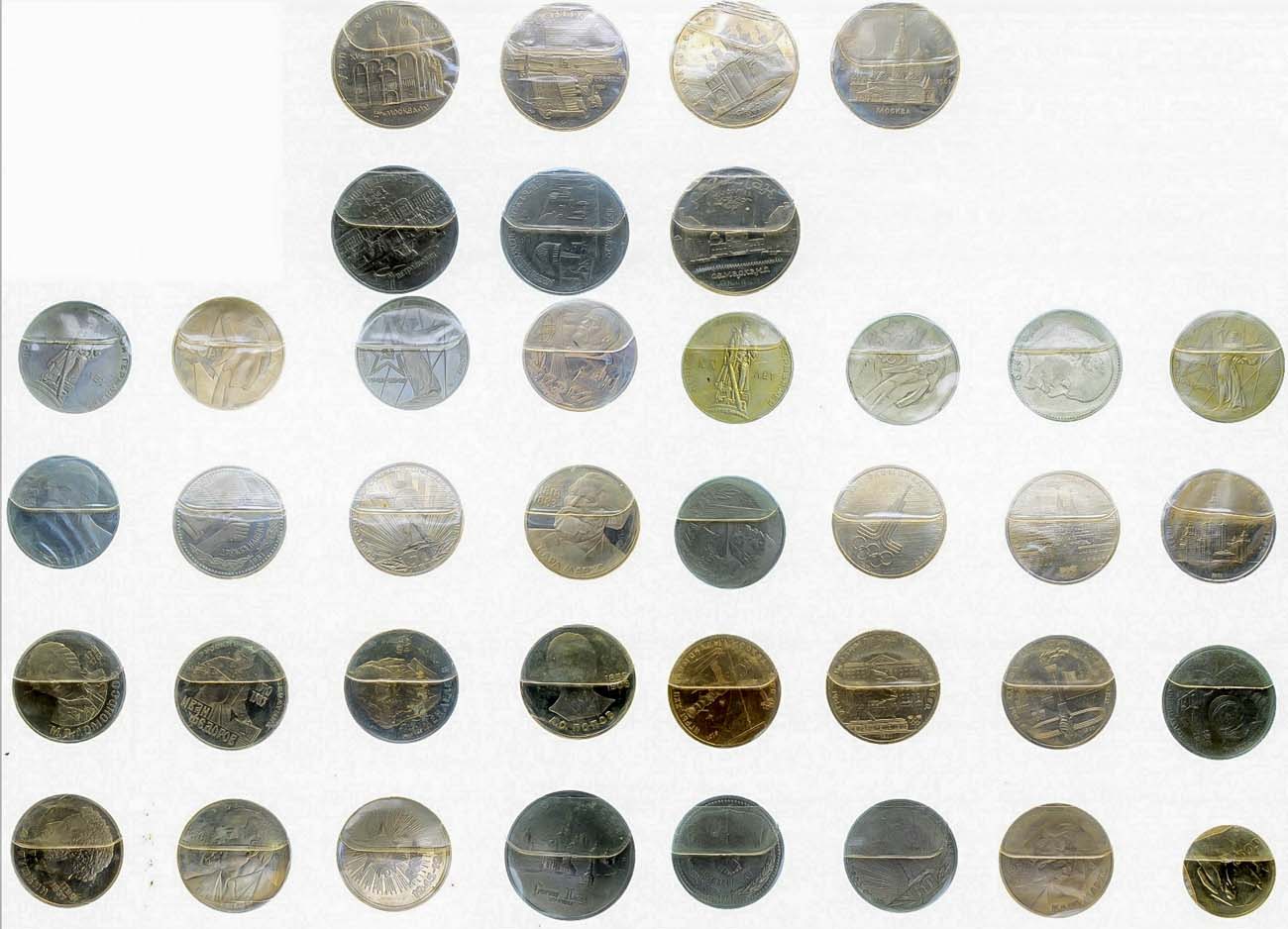 Медно-никелевый сплав. 59 монет по 1 рублю 1965-1991 гг. 3 монеты по 3 рубля 1987-1991 гг. 8 монет по 5 рублей 1989-1993 гг. 50 копеек 1967 года. 50 лет революции. XF/PROOF.