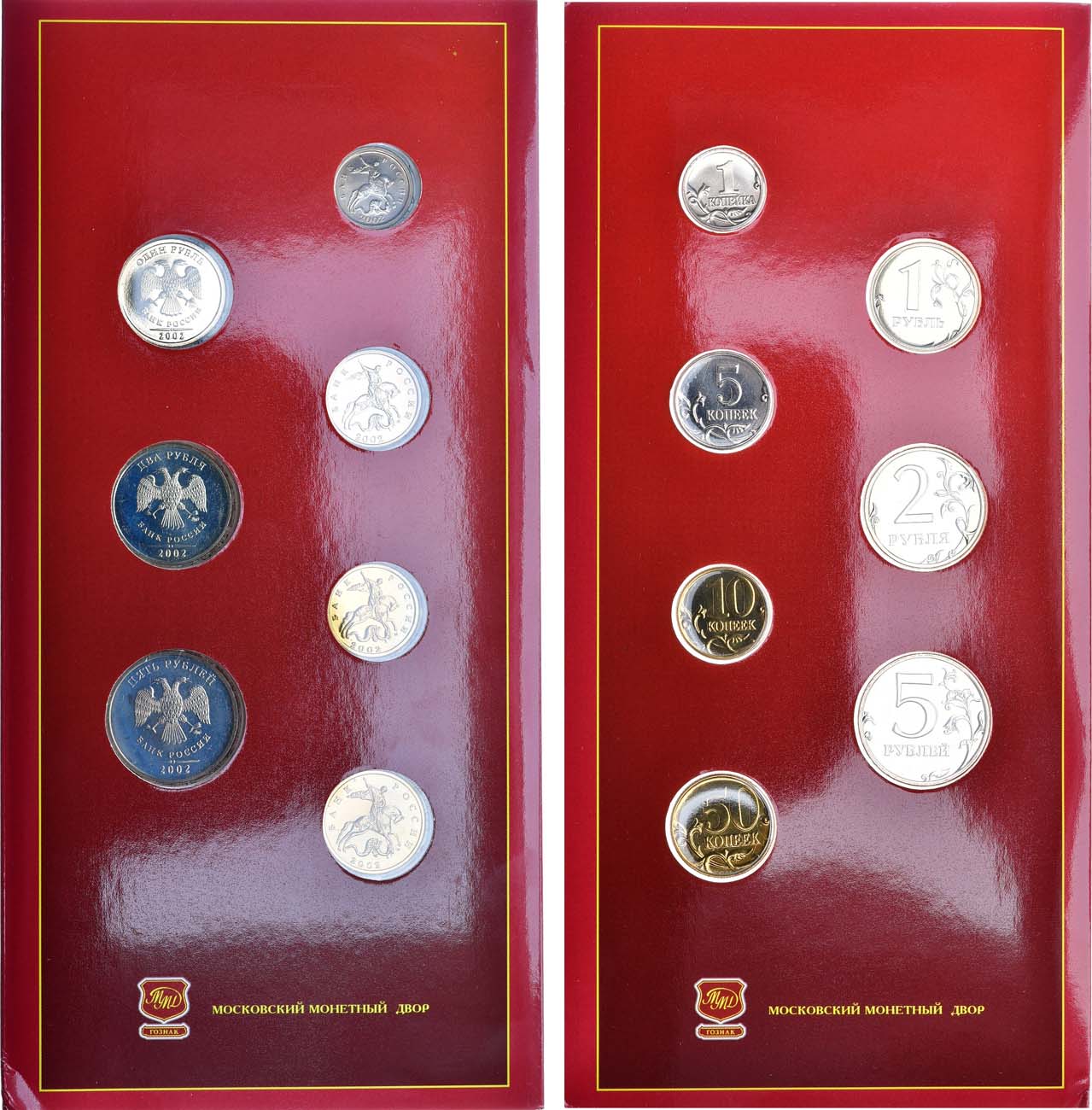 Московский монетный двор. В набор входят 5 рублей, 2 рубля, 1 рубль, 50 копеек, 10 копеек, 5 копеек, 1 копейка 2002 года. Монеты вставлены в картонный трафарет. BU.