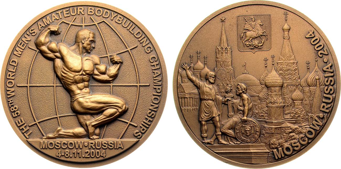 Томпак. 146,67г. Диаметр 65 мм. Скульптор А.Ф.Шамаев, Медальер К.В.Корнеев. Аверс: "THE 58th WORLD MENS AMATEUR BODYBUILDING CHAMPIONSHIPS". Внизу медали на выступающей плоскости надпись "MOSCOW-RUSSIA. 4-8.11.2004". Реверс: рельефное фантазийное изображение видов центра Москвы со Спасской башней, Храма Василия Блаженного, Кремля. На переднем плане медали изображен памятник Минину и Пожарскому. В верхней части медали рельефный герб Москвы. UNC.