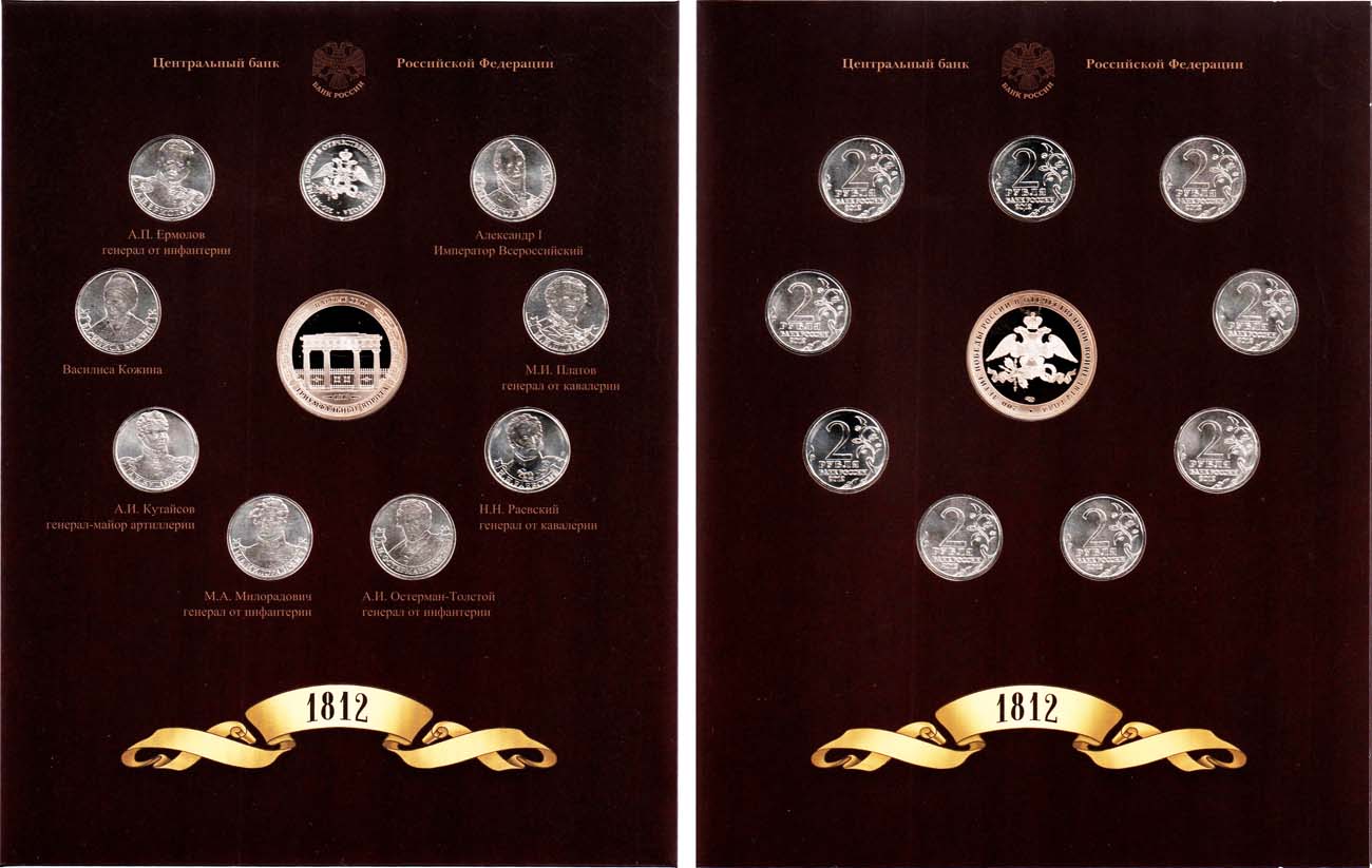 Никелированная сталь. 2 рубля 2012 года. ММД. Генерал от инфантерии А.П. Ермолов. КМ 1400. BU. 2 рубля 2012 года. ММД. Организатор партизанского движения Василиса Кожина. КМ 1401. BU. 2 рубля 2012 года. ММД. Генерал-майор А.И Кутайсов. КМ 1402. BU. 2 рубля 2012 года. ММД. Генерал от инфантерии М.А. Милорадович. КМ 1403. BU. 2 рубля 2012 года. ММД. Генерал от инфантерии А.И. Остерман-Толстой. КМ 1404. BU. 2 рубля 2012 года. ММД. Генерал от кавалерии Н.Н. Раевский. КМ 1405. BU. 2 рубля 2012 года. ММД. Генерал от кавалерии М.И. Платов. КМ 1406. BU. 2 рубля 2012 года. ММД. Император Александр I. КМ 1407. BU. 2 рубля 2012 года. ММД. 200 лет победы. КМ 1391. BU. Жетон 2012 года. Диаметр 35 мм. СПМД. Триумфальные ворота. Царское село. BU. BU.