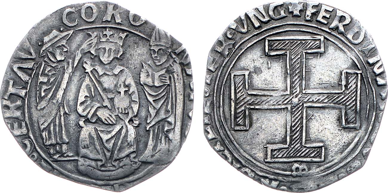 Серебро. 3,46г. Минцмейстер Savlatore Miroballo (M под крестом). Аверс: "CORONATVS • QVIA • LEGITIME • CERTAVIT" (Коронован в законном стремлении). Папский легат - кардинал и архиепископ Бари (Bari) Латино Орсино (Latino Orsino) водружает корону на голову короля (Фердинанда) сидящего на троне. Реверс: "FERDINANDVS D G R SICI IER VN". Иерусалимский крест в центре. XF.