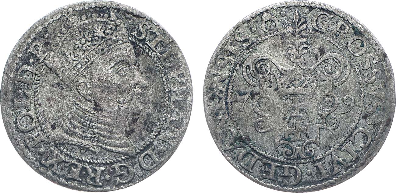 Серебро. 1,96г. Гданьск (Данциг). Аверс: " STEPHAN D G REX POL D P". Реверс: "GROSSVS CIVI GEDANENSIS". Kopicki 7433. XF.