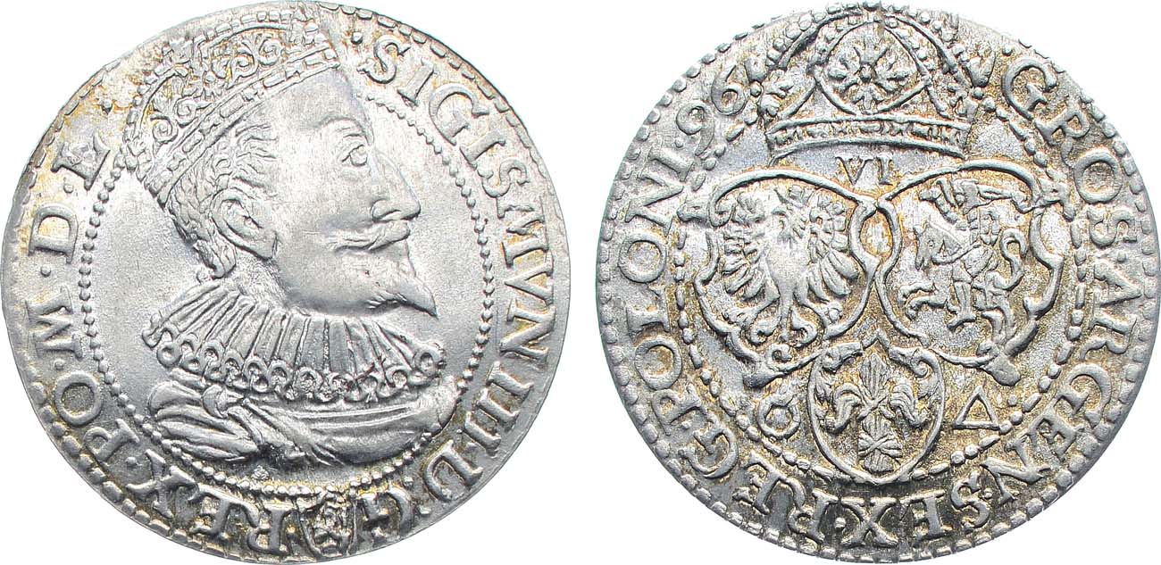 Серебро. 4,68г. Мальборк (Мариенбург). Аверс: "•SIGISMVN•III•D•G - REX•POL•M•D•L: ". Реверс: гербы Польши, Литвы и Вазы "GROS•ARGEN•SEX•REG•POLONI•96". Kopicki 1240(R1). AU/UNC.