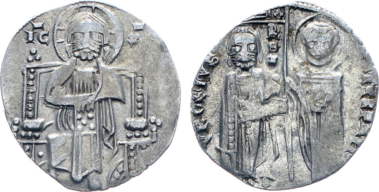 Серебро. 1,77г. Аверс: "VROSIVS REX SSTEFAN", святой Стефан держит в левой руке Евангелие, в правой руке преподносит королю знамя. Реверс: "IC - XC", Иисус Христос на троне. AU.
