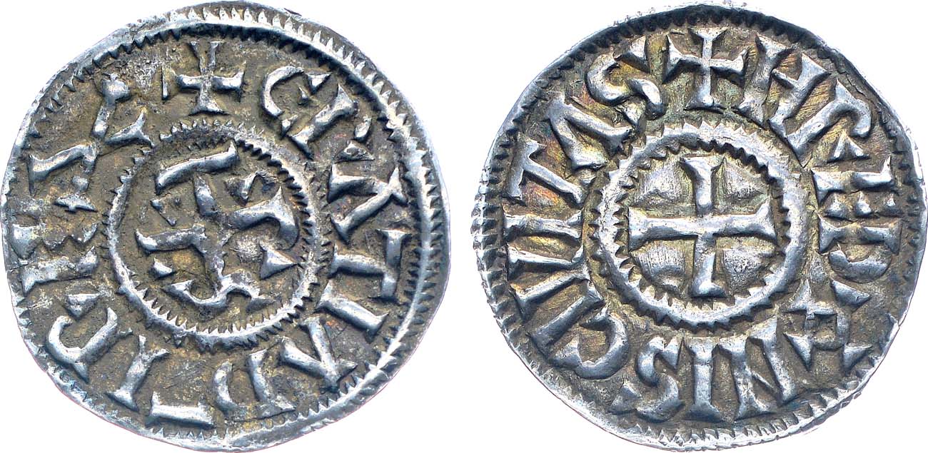 Серебро. 1,54г. Ренн. Аверс: крест внутри окружности; легенда "+HRED NIS CIVITAS". Реверс: каролингская монограмма; легенда "GRATIA D-I REX". XF/AU.
