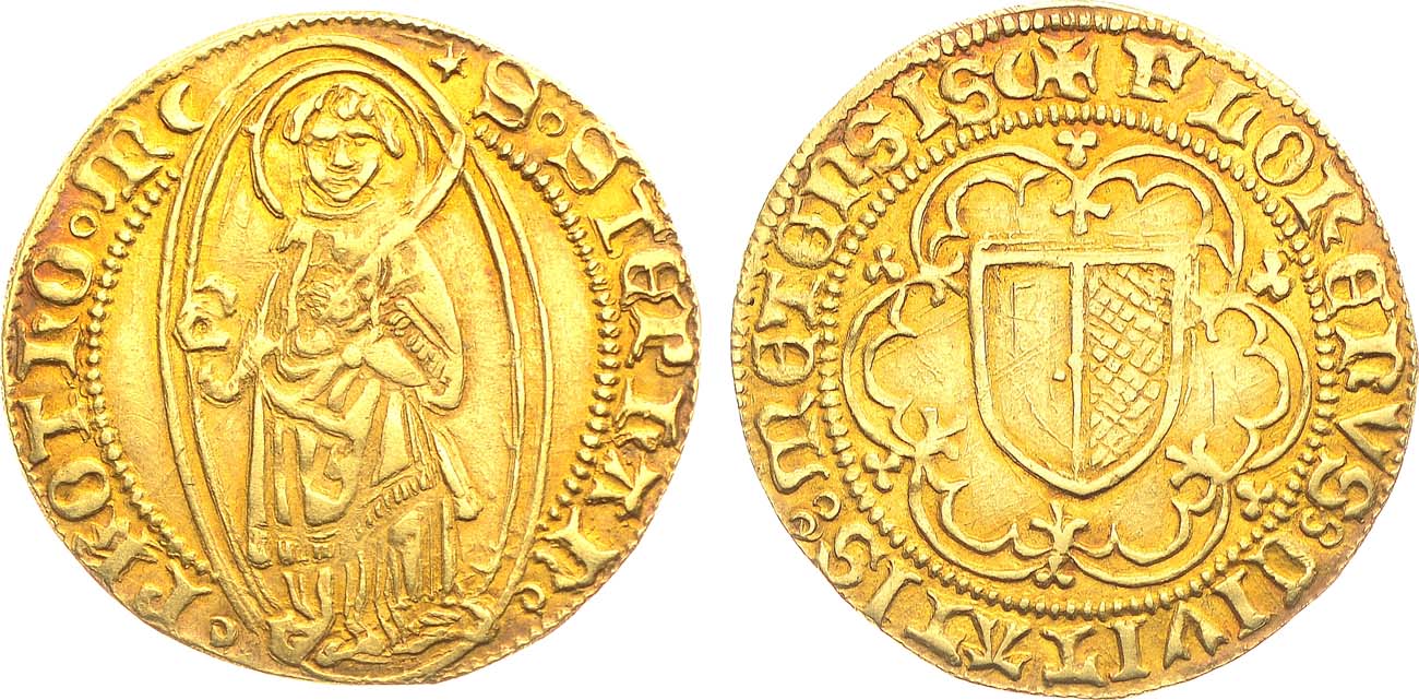 Золото. 3,13г. Метц. Аверс: "*S° STEPhAN° - °PROThO° M (croissant)" Святой Стефан в нимбе, стоит влево.. Реверс: "* FLORENVS8 CIVITATIS8 METENSIS (полумесяц)" Городской герб украшенный цветами и клевером. Flon p.517 var. Fr. 164. XF.