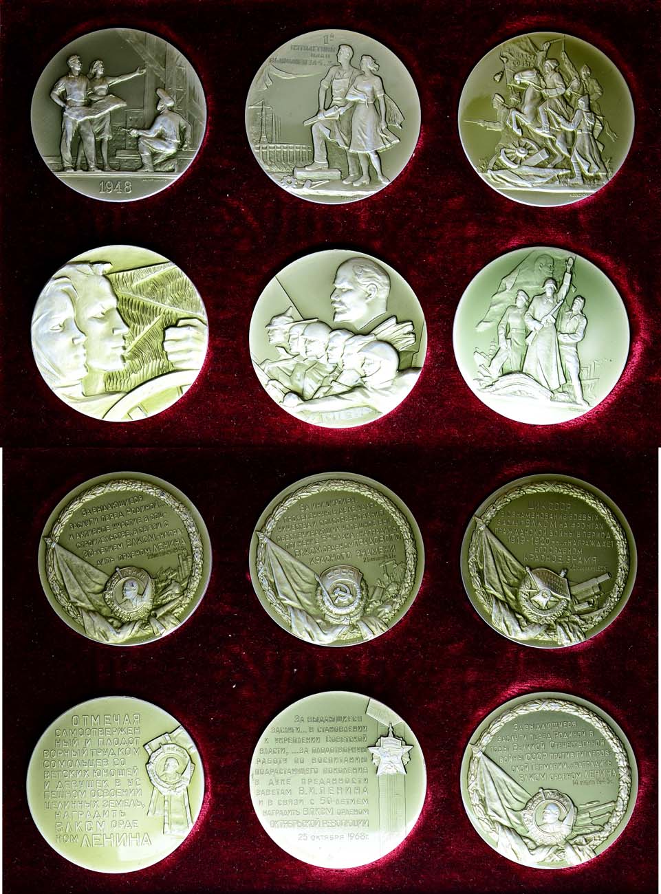 Алюминий, лак. Медаль 1962 года. Награждение ВЛКСМ орденом Красного Знамени за боевые заслуги на фронтах гражданской войны в период 1919-1920 гг. Алюминий, лак, 29,80 г. Диаметр 58 мм. Ленинградский монетный двор. Медальеры: аверс — А.В.Козлов (внизу у окружности: "А.КОЗЛОВ"), реверс — Н.А.Соколов (справа под обрезом: "Н.СОКОЛОВ"). Шкурко, Салыков 270. Медаль 1962 года. Награждение ВЛКСМ орденом Трудового Красного Знамени за успешное выполнение первого пятилетнего плана. Алюминий, лак, 27,36 г. Диаметр 58 мм. Ленинградский монетный двор. Медальеры: аверс — А.В.Козлов (внизу у окружности: "А.КОЗЛОВ"), реверс — Н.А.Соколов (справа под обрезом: "Н.СОКОЛОВ"). Шкурко, Салыков 271. Медаль 1962 года. Награждение ВЛКСМ орденом Ленина за выдающиеся заслуги в годы Великой Отечественной войны. Алюминий, лак, 30,23 г. Диаметр 58 мм. Ленинградский монетный двор. Медальеры: аверс — А.В.Козлов (внизу у окружности: "А.КОЗЛОВ"), реверс — Н.А.Соколов (справа под обрезом: "Н.СОКОЛОВ"). Шкурко, Салыков 272. Медаль 1962 года. Награждение ВЛКСМ вторым орденом Ленина за активное участие в социалистическом строительстве и в связи с 30-летием. Алюминий, лак, 27,79 г. Диаметр 58 мм. Ленинградский монетный двор. Медальеры: аверс — А.В.Козлов (внизу у окружности: "А.КОЗЛОВ"), реверс — В.М.Акимушкина (справа под обрезом: "В.АКИМУШКИНА"). Шкурко, Салыков 273. Медаль 1963 года. Награждение ВЛКСМ орденом Ленина за успешное освоение целинных земель. Алюминий, лак, 26,23 г. Диаметр 58 мм. Ленинградский монетный двор. Медальер Е.А.Штейнман (аверс — справа внизу под орденской лентой: "ШТЕЙМА"). Шкурко, Салыков 316. Медаль 1970 года. Награждение ВЛКСМ орденом Октябрьской революции в связи с 50-летием. Алюминий, лак, 31,33 г. Диаметр 58 мм. Ленинградский монетный двор. Медальер Б.Л.Старис (реверс — справа над плечом космонавта: "Б.СТАРИС"). Шкурко, Салыков 641. UNC.