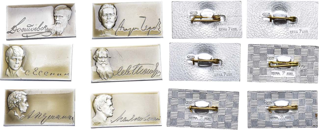 Алюминий, лак. Знак "А.С. Пушкин". Алюминий, лак. Вес, 2,34 гр. Размер 31х17 мм. Ленинградский монетный двор, 1960-1970-е гг. Монограмма монетного двора на поле реверсе: "ЛМД". AU/UNC. Знак "Ф.М. Достоевский". Алюминий, лак. Вес, 2,16 гр. Размер 31х17 мм. Ленинградский монетный двор, 1960-1970-е гг. Монограмма монетного двора на поле реверсе: "ЛМД". AU/UNC. Знак "Л.Н. Толстой". Алюминий, лак. Вес, 2,88 гр. Размер 31х17 мм. Ленинградский монетный двор, 1960-1970-е гг. Монограмма монетного двора на поле реверсе: "ЛМД". AU/UNC. Знак "А.П. Чехов". Алюминий, лак. Вес, 2,36 гр. Размер 31х17 мм. Ленинградский монетный двор, 1960-1970-е гг. Монограмма монетного двора на поле реверсе: "ЛМД". AU/UNC. Знак "С.А. Есенин". Алюминий, лак. Вес, 2,15 гр. Размер 31х17 мм. Ленинградский монетный двор, 1960-1970-е гг. Монограмма монетного двора на поле реверсе: "ЛМД". AU/UNC. Знак "В.В. Маяковский". Алюминий, лак. Вес, 2,19 гр. Размер 31х17 мм. Ленинградский монетный двор, 1960-1970-е гг. Монограмма монетного двора на поле реверсе: "ЛМД". AU/UNC. AU/UNC.