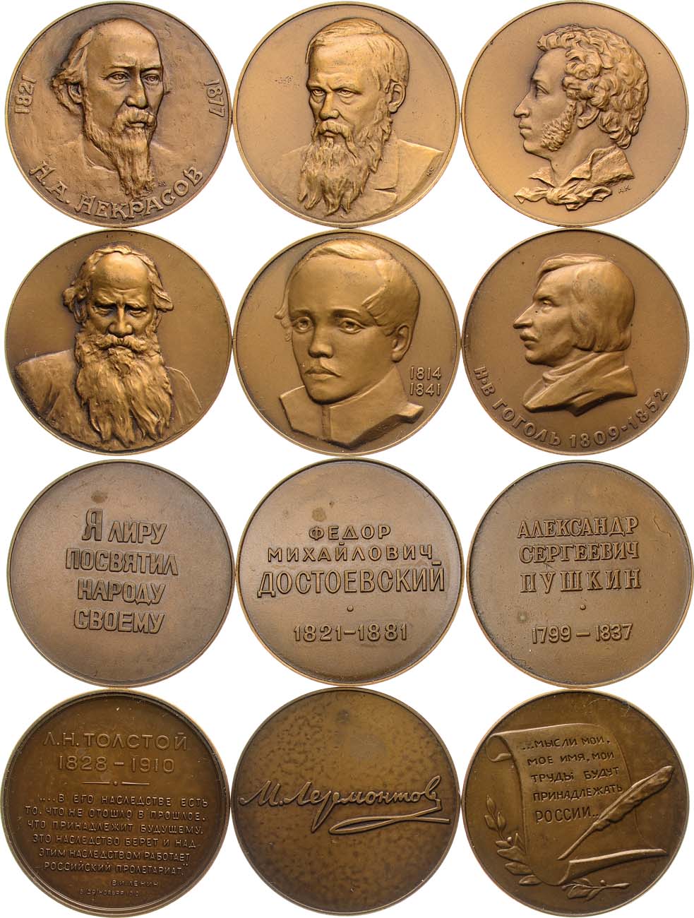 Томпак. СССР. Медаль 1977 года. Томпак. 29,38 г. Н.В. Гоголь. ЛМД. Медальер А.И. Южакова (на аверсе в обрезе "Ю"). Шкурко, Салыков 1063a. UNC. СССР. Медаль 1977 года. Томпак. 29,49 г. Ф.М. Достоевский. ЛМД. Медальер Н.А. Соколов (на аверсе в обрезе "H C"). Шкурко, Салыков 1068б. UNC. СССР. Медаль 1977 года. Томпак. 29,47 г. М.Ю. Лермонтов. ЛМД. Медальер Ю.Д. Стручков (на аверсе в обрезе "Ю C"). Шкурко, Салыков 1076. UNC. СССР. Медаль 1977 года. Томпак. 28,8 г. Н.А. Некрасов. ЛМД. Медальеры: А.В. Козлов (на аверсе внизу справа "А К"), М.Е. Эшба (без подписи). Шкурко, Салыков 1081. UNC. СССР. Медаль 1977 года. Томпак. 28,87 г. А.С. Пушкин. ЛМД. Медальер А.В. Козлов (на аверсе внизу справа "А К"). Шкурко, Салыков 1084б. UNC. СССР. Медаль 1977 года. Томпак. 29,59 г. Л.Н. Толстой. ЛМД. Медальер Н.А. Соколов (на аверсе в обрезе "Н С"). Шкурко, Салыков 1089б. UNC. UNC.