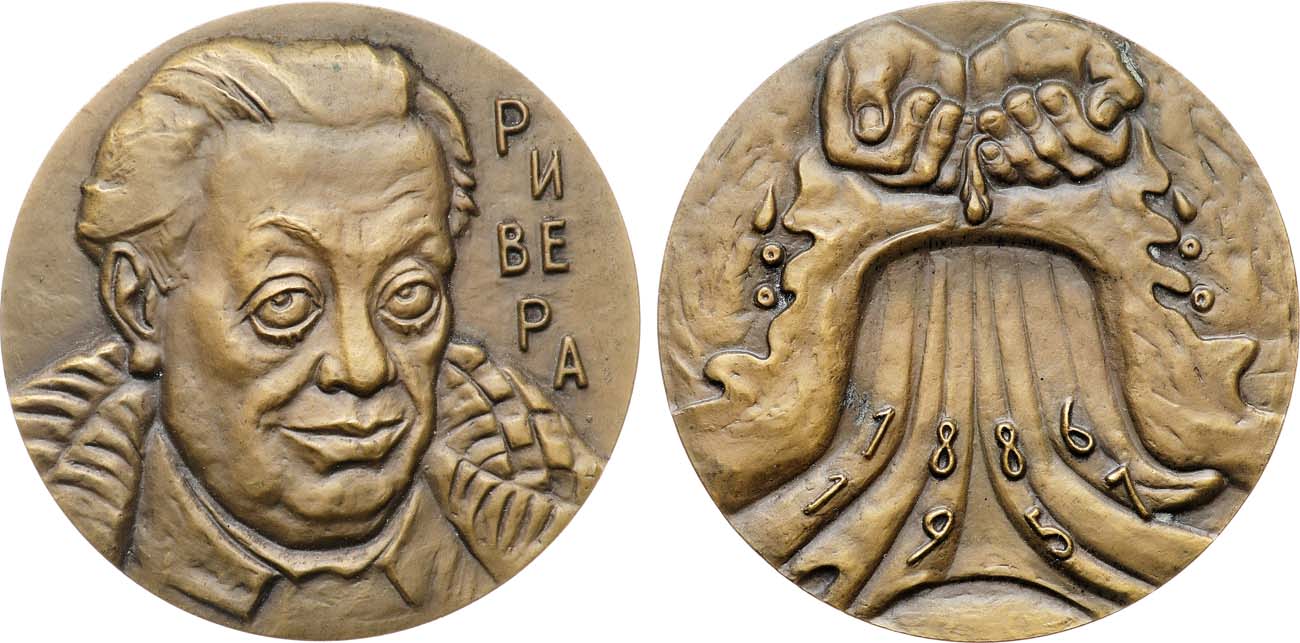 Диего Ривера (1886-1957 гг.) - мексиканский живописец, монументалист, политический деятель левых взглядов. Он экспериментировал с различными стилями, от импрессионизма до кубизма, что позволило ему развить свой уникальный художественный язык. Он считал, что искусство должно служить социальным и политическим целям, и его работы часто содержали социальную критику и политические идеи. Среди наиболее известных работ Д. Риверы - фрески в Национальном дворце в Мехико, Министерстве образования и Дворце изящных искусств. Эти монументальные произведения изображают ключевые моменты истории и культуры Мексики, от древних цивилизаций до современности. Из Краснодарской коллекции монет и медалей.