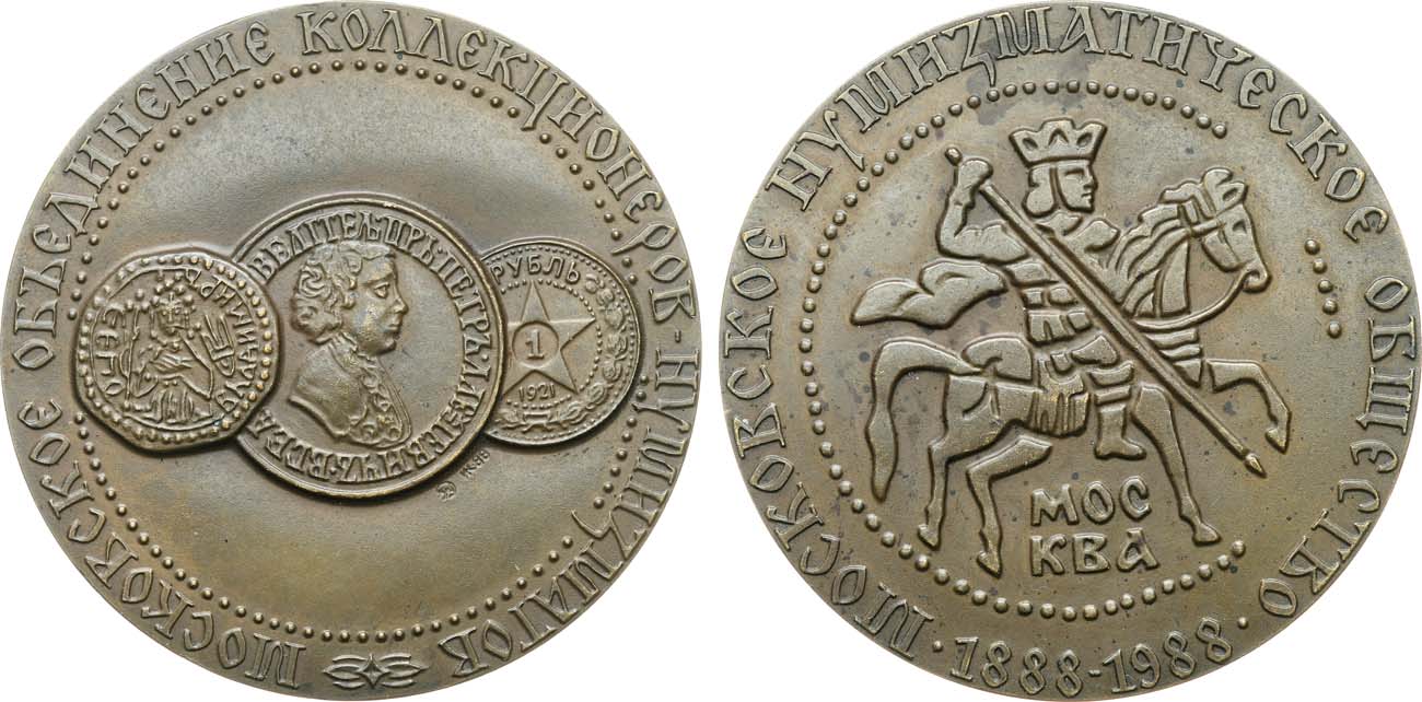 Московское нумизматическое общество создано в 1888 году участниками кружка нумизматов при Московском археологическом обществе. В 1924 году общество прекратило существование, его нумизматическая коллекция и библиотека переданы Историческому музею. В 1988 году общество было воссоздано.