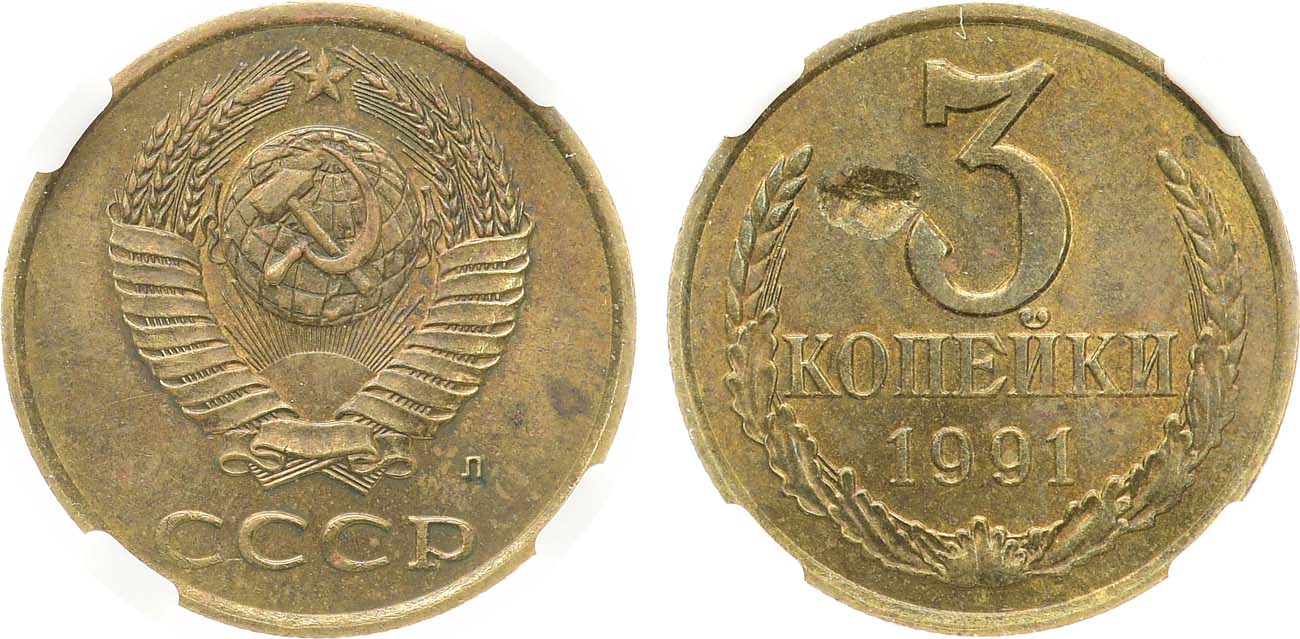 Медно-цинковый сплав. Ленинградский монетный двор. Реверс: следы засорения штемпеля. Соосность сторон 15°. MS 61.