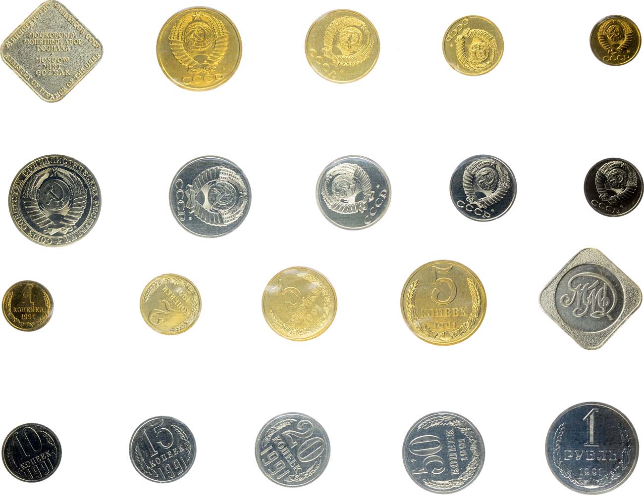 Московский монетный двор. Гибкий пластик. В набор входят: алюминиевый жетон ММД квадратной формы со скругленными краями, 1 рубль, 50 копеек, 20 копеек, 15 копеек, 10 копеек, 5 копеек, 3 копейки, 2 копейки, 1 копейка. Петров, Федорин с. 152. BU.