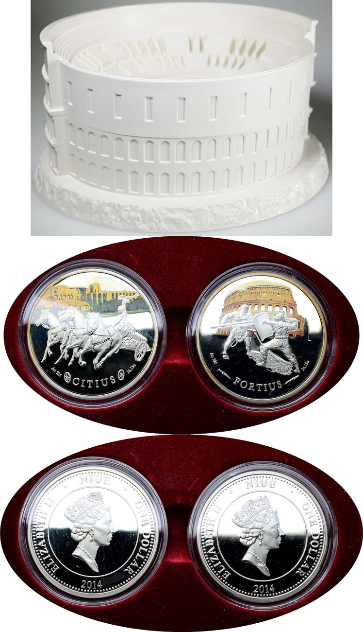 Серебро 925 пробы. Ниуэ. 1 доллар 2014 года. Цветная эмаль. Колизей - "Сильнее" (FORTIUS). Тираж 5000 экз. KM 350. PROOF. Ниуэ. 1 доллар 2014 года. Цветная эмаль. Колизей - "Быстрее" (CITIUS). Тираж 5000 экз. KM 351. PROOF. PROOF.