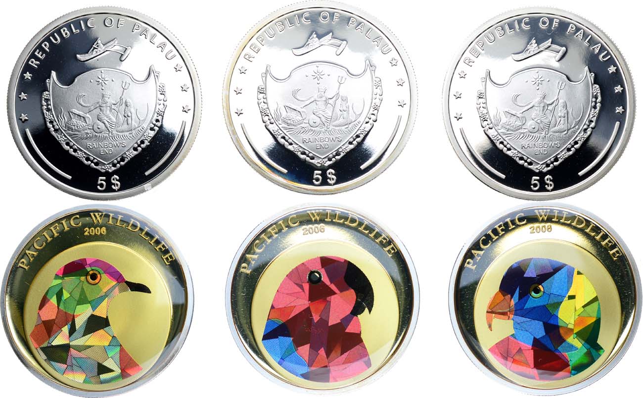 Серебро 925 пробы. 5 долларов 2006 года. Великолепный пёстрый голубь. 25 г. Тираж: 5000 экз. KM 188. 5 долларов 2006 года. Благородный зелёно-красный попугай. 25 г. Тираж: 5000 экз. KM 187. 5 долларов 2006 года. Радужный лорикет. 25 г. Тираж: 5000 экз. KM 186. PROOF.
