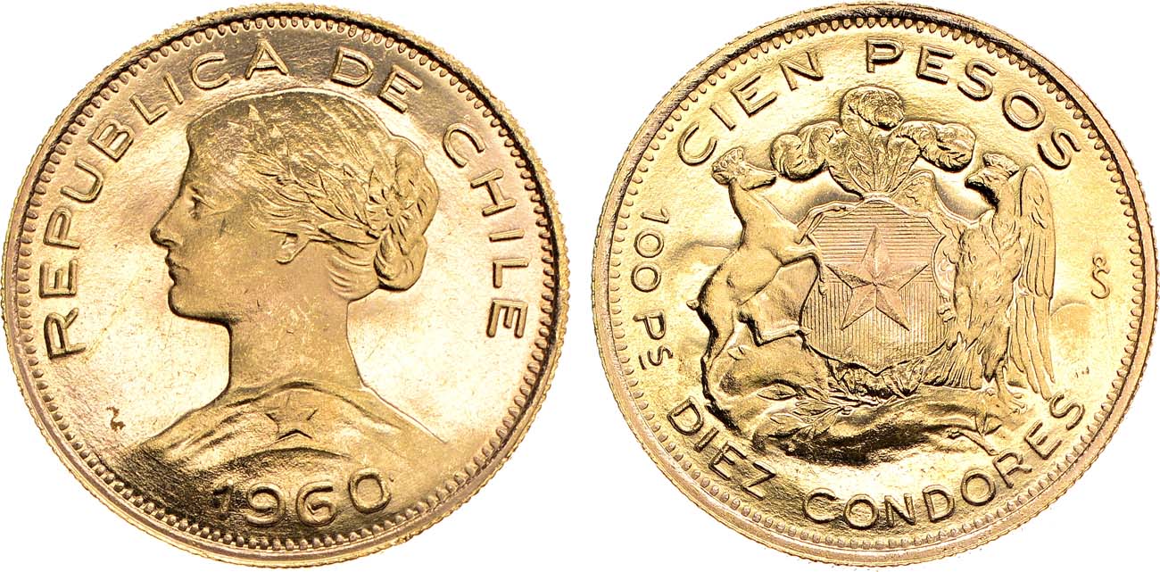 Золото 900 пробы. 20,33г. Сантьяго (So). Тираж 200000 экз. KM 175. UNC.