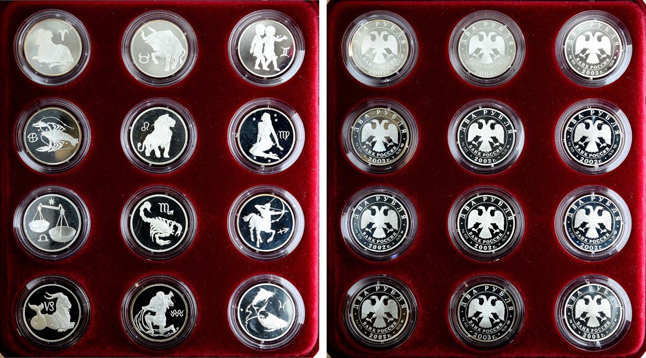 Серебро 925 пробы. 2 рубля 2002 года. ММД. Серебро. 17 г. Скорпион. Тираж 20000 экз. ЦБ РФ 5110-0043. PROOF. 2 рубля 2002 года. СПМД. Серебро. 17 г. Стрелец. Тираж 20000 экз. ЦБ РФ 5110-0044. PROOF. 2 рубля 2002 года. ММД. Серебро. 17 г. Козерог. Тираж 20000 экз. ЦБ РФ 5110-0045. PROOF. 2 рубля 2002 года. ММД. Серебро. 17 г. Лев. Тираж 20000 экз. ЦБ РФ 5110-0040. PROOF. 2 рубля 2002 года. СПМД. Серебро. 17 г. Дева. Тираж 20000 экз. ЦБ РФ 5110-0041. PROOF. 2 рубля 2002 года. ММД. Серебро. 17 г. Весы. Тираж 20000 экз. ЦБ РФ 5110-0042. PROOF. 2 рубля 2003 года. ММД. Серебро. 17 г. Близнецы. Тираж 20000 экз. ЦБ РФ 5110-0051. PROOF. 2 рубля 2003 года. СПМД. Серебро. 17 г. Водолей. Тираж 20000 экз. ЦБ РФ 5110-0047. PROOF. 2 рубля 2003 года. ММД. Серебро. 17 г. Овен. Тираж 20000 экз. ЦБ РФ 5110-0049. PROOF. 2 рубля 2003 года. СПМД. Серебро. 17 г. Рак. Тираж 20000 экз. ЦБ РФ 5110-0052. PROOF. 2 рубля 2003 года. ММД. Серебро. 17 г. Рыбы. Тираж 20000 экз. ЦБ РФ 5110-0048. PROOF. 2 рубля 2003 года. СПМД. Серебро. 17 г. Телец. Тираж 20000 экз. ЦБ РФ 5110-0050. PROOF.