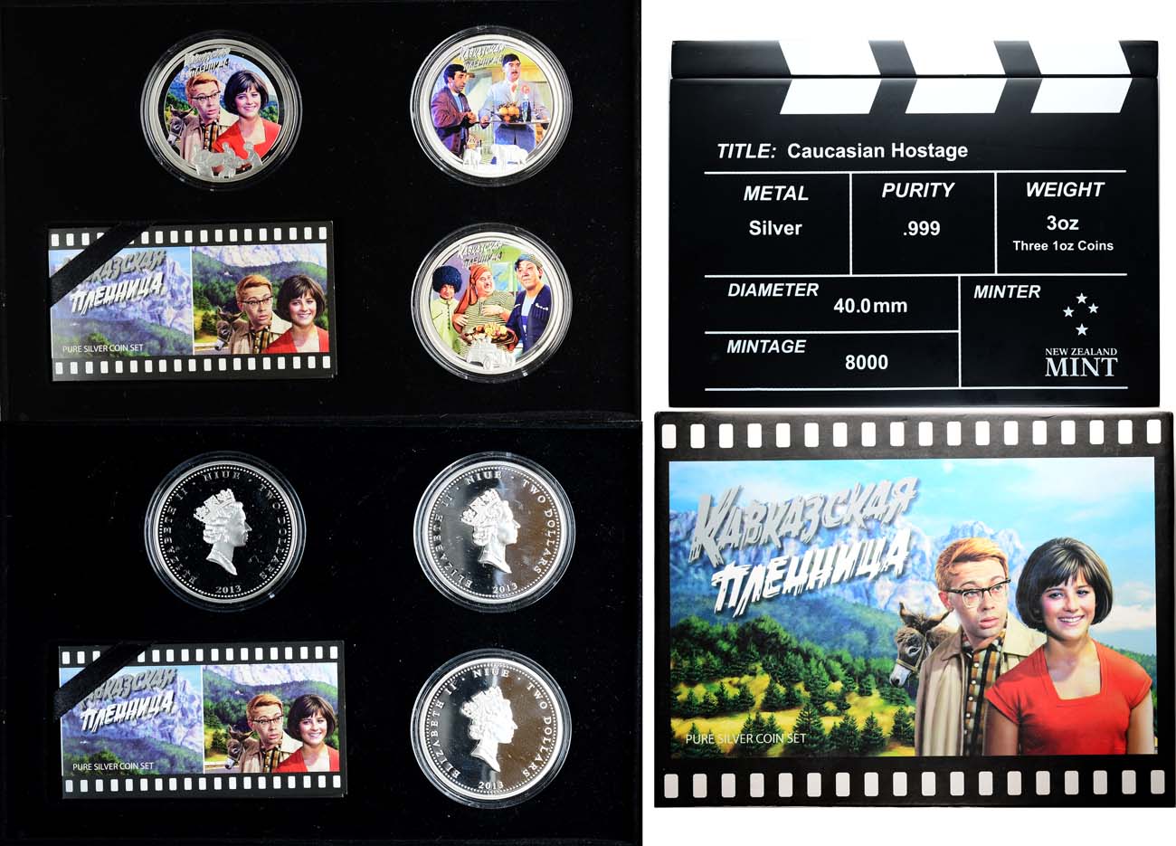 Серебро 999 пробы. Ниуэ. 2 доллара 2013 года. 31,1 г. Новая Зеландия. Цветная эмаль. Оригинальная капсула. Шурик и Нина. КМ 1136. Ниуэ. 2 доллара 2013 года. 31,1 г. Новая Зеландия. Цветная эмаль. Оригинальная капсула. Товарищ Саахов и Джабраил. КМ 1137. Ниуэ. 2 доллара 2013 года. 31,1 г. Новая Зеландия. Цветная эмаль. Оригинальная капсула. Трус, Балбес, Бывалый. КМ 986. PROOF.