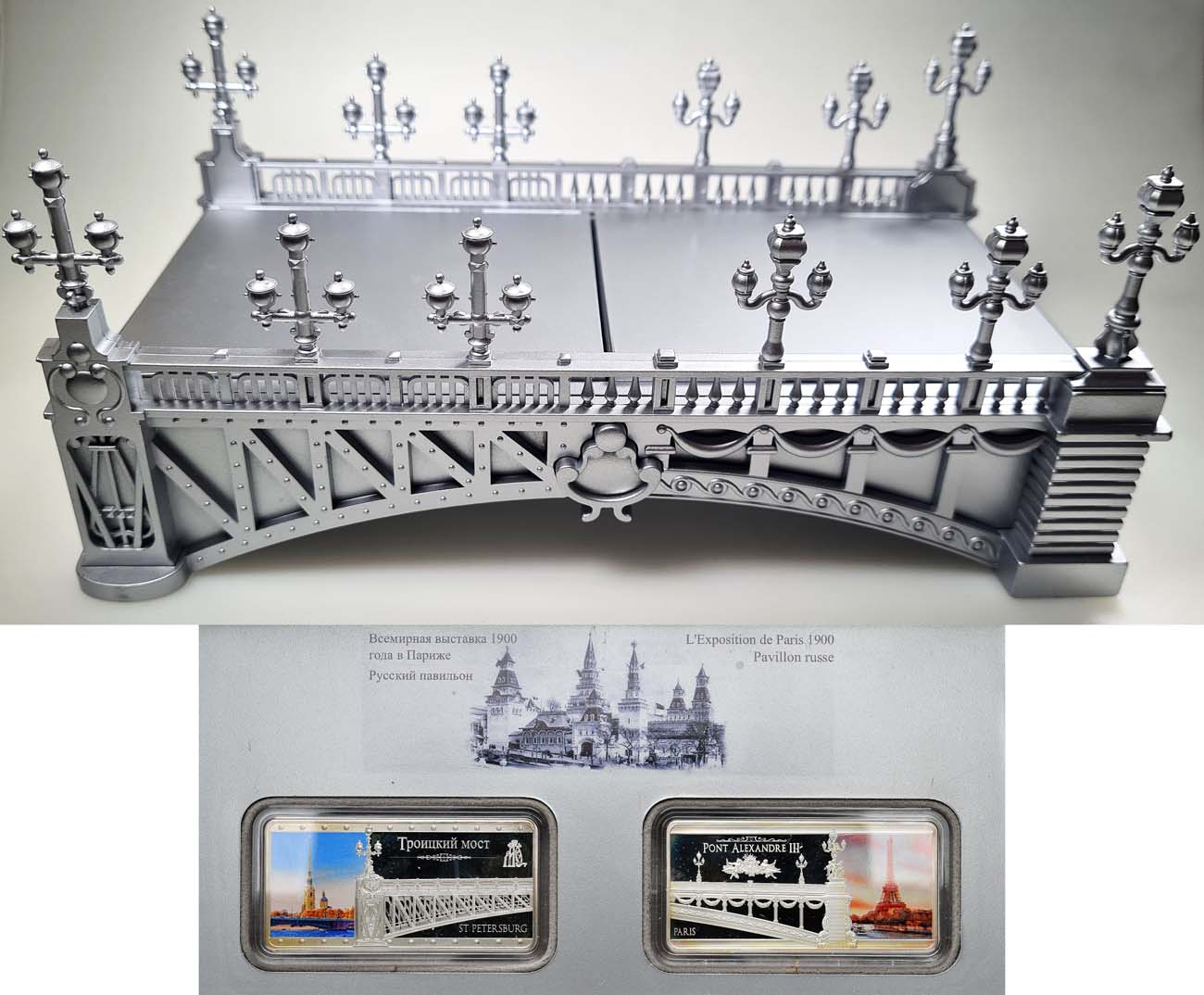 Серебро 999 пробы. Размер 57х38 мм. Троицкий мост. 31,1 г. Цветная эмаль. Тираж 8000 экз. Размер 57х38 мм. Мост Александра III в Париже. 31,1 г. Цветная эмаль. Тираж 8000 экз. PROOF.
