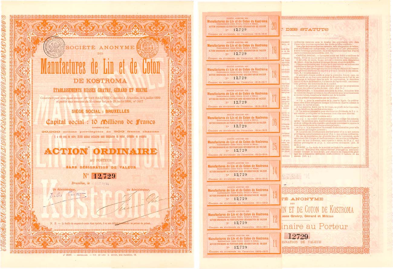 №12729. С талонным листом на 10 талонов (№11-20). Уставной капитал 10000000 франков. Подписи рукописные. AU.