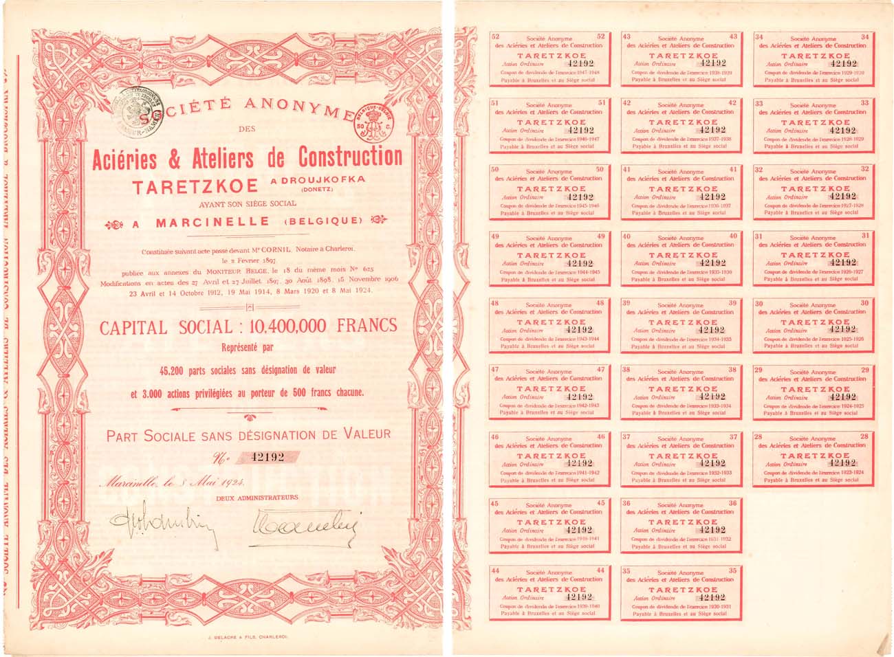 Торецкое сталелитейное и механическое общество в Дружковке было основано весной 1898 г. бельгийскими промышленниками для постройки Торецкого сталелитейного и механического завода. Завод изготавливал оборудование для железных дорог. После революции, в октябре 1917 г. заводы в Дружковке были остановлены и постепенно разграблены. В августе 1920 г. на базе двух заводов: Донецкого чугунолитейного и сталелитейного завода и Торецкого сталелитейного и механического завода был создан Торецкий сталелитейный и механический завод им. Ворошилова, будущий Дружковский машиностроительный завод.