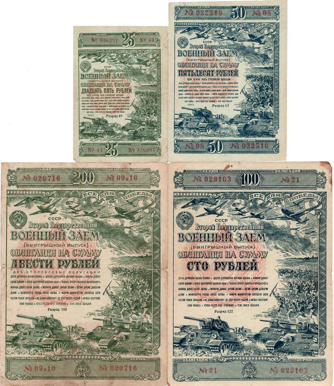 СССР. Облигация на сумму 200 рублей 1943 года. Разряд 180. Серия №020716 №09 и 10. Второй Государственный военный заем, выигрышный выпуск. СССР. Облигация на сумму 100 рублей 1943 года. Разряд 122. Серия №029103 №21. Второй Государственный военный заем, выигрышный выпуск. СССР. Облигация на сумму 50 рублей 1943 года. Разряд 63. Серия №032510 №08. Второй Государственный военный заем, выигрышный выпуск. СССР. Облигация на сумму 25 рублей 1943 года. Разряд 49. Серия №036397 №44. Второй Государственный военный заем, выигрышный выпуск. VF/XF.