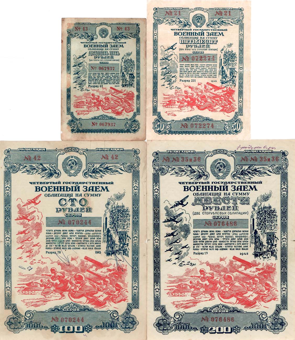 СССР. Облигация на сумму 200 рублей 1945 года. Разряд 19. Серия №076486 №35 и 36. Четвёртый Государственный военный заем. СССР. Облигация на сумму 100 рублей 1945 года. Разряд 78. Серия №070244 №42. Четвёртый Государственный военный заем. СССР. Облигация на сумму 50 рублей 1945 года. Разряд 231. Серия №072274 №21. Четвёртый Государственный военный заем. СССР. Облигация на сумму 25 рублей 1945 года. Разряд 61. Серия №067937 №43. Четвёртый Государственный военный заем. VF-/VF.