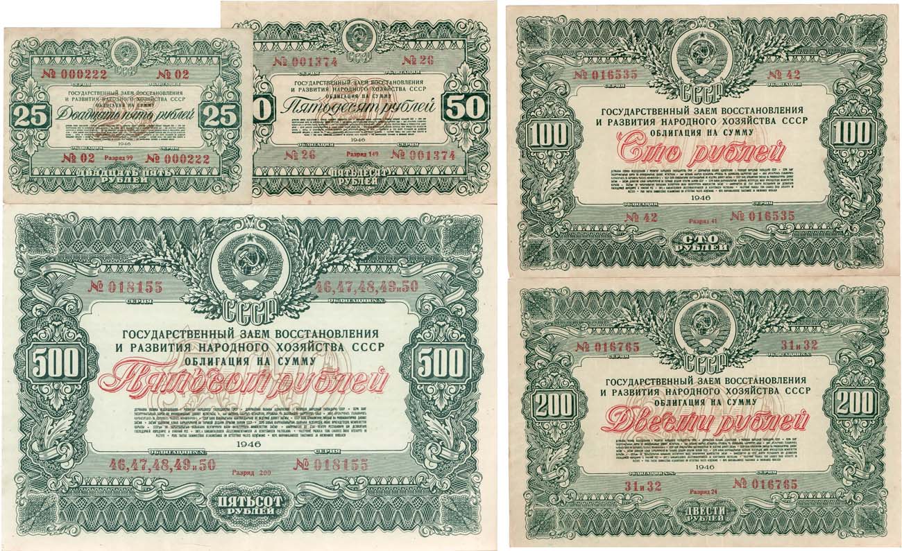 СССР. Облигация на сумму 500 рублей 1946 года. Разряд 200. Серия №018155 №46, 47, 48, 49, 50. Гос. заем восстановления и развития нар. хозяйства. СССР. Облигация на сумму 200 рублей 1946 года. Разряд 24. Серия №016765 №31,32. Гос. заем восстановления и развития народного хозяйства. СССР. Облигация на сумму 100 рублей 1946 года. Разряд 41. Серия №016535 №42. Гос. заем восстановления и развития народного хозяйства. СССР. Облигация на сумму 50 рублей 1946 года. Разряд 149. Серия №001374 №26. Гос. заем восстановления и развития народного хозяйства. СССР. Облигация на сумму 25 рублей 1946 года. Разряд 99. Серия №000222 №02. Гос. заем восстановления и развития народного хозяйства. VF/XF.