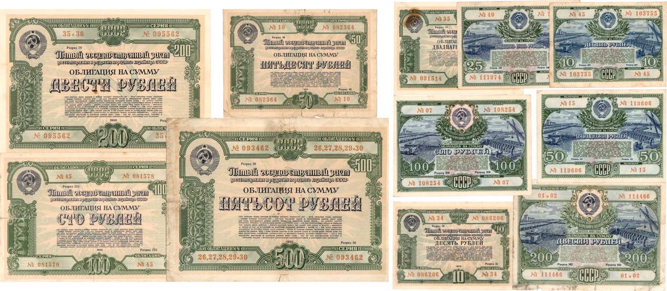 СССР. Облигация на сумму 500 рублей 1950 года. Разряд 56. Серия №093462 №26,27,28,29,30. Пятый государственный заем восстановления народного хозяйства. СССР. Облигация на сумму 200 рублей 1950 года. Разряд 70. Серия №095562 №35,36. Пятый государственный заем восстановления народного хозяйства. СССР. Облигация на сумму 100 рублей 1950 года. Разряд 225. Серия №081578 №45. Пятый государственный заем восстановления народного хозяйства. СССР. Облигация на сумму 50 рублей 1950 года. Разряд 48. Серия №082364 №10. Пятый государственный заем восстановления народного хозяйства. СССР. Облигация на сумму 25 рублей 1950 года. Разряд 51. Серия №091514 №35. Пятый государственный заем восстановления народного хозяйства. СССР. Облигация на сумму 10 рублей 1950 года. Разряд 55. Серия №086206 №34. Пятый государственный заем восстановления народного хозяйства. СССР. Облигация на сумму 200 рублей 1951 года. Разряд 262. Серия №114466 №01,02. Государственный заем развития народного хозяйства. СССР. Облигация на сумму 100 рублей 1951 года. Разряд 310. Серия №108254 №07. Государственный заем развития народного хозяйства. СССР. Облигация на сумму 50 рублей 1951 года. Разряд 151. Серия №119606 №15. Государственный заем развития народного хозяйства. СССР. Облигация на сумму 25 рублей 1951 года. Разряд 158. Серия №117974 №40. Государственный заем развития народного хозяйства. СССР. Облигация на сумму 10 рублей 1951 года. Разряд 077. Серия №103755 №45. Государственный заем развития народного хозяйства. VF-/XF.