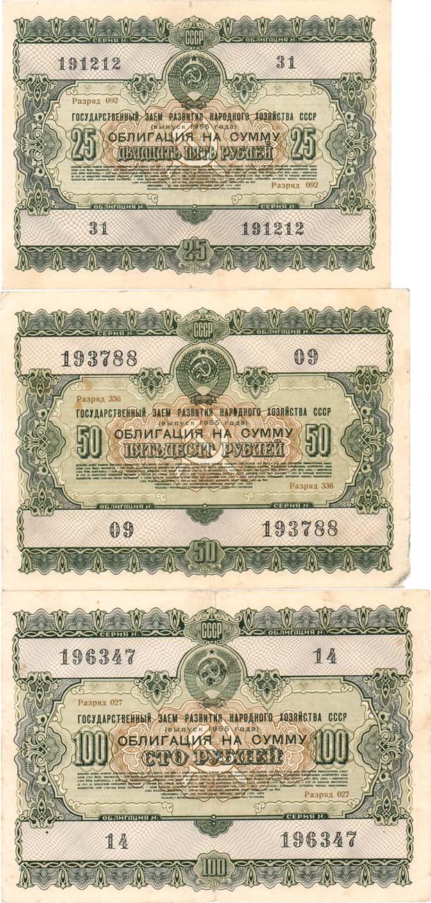 Облигация на 25 рублей выпуска 1955 года. Разряд 092. №31, Серия 191212. XF. Облигация на 50 рублей выпуска 1955 года. Разряд 336. №09, Серия 193788. XF. Облигация на 100 рублей выпуска 1955 года. Разряд 027. №14, Серия 196347. VF/XF. VF/XF.