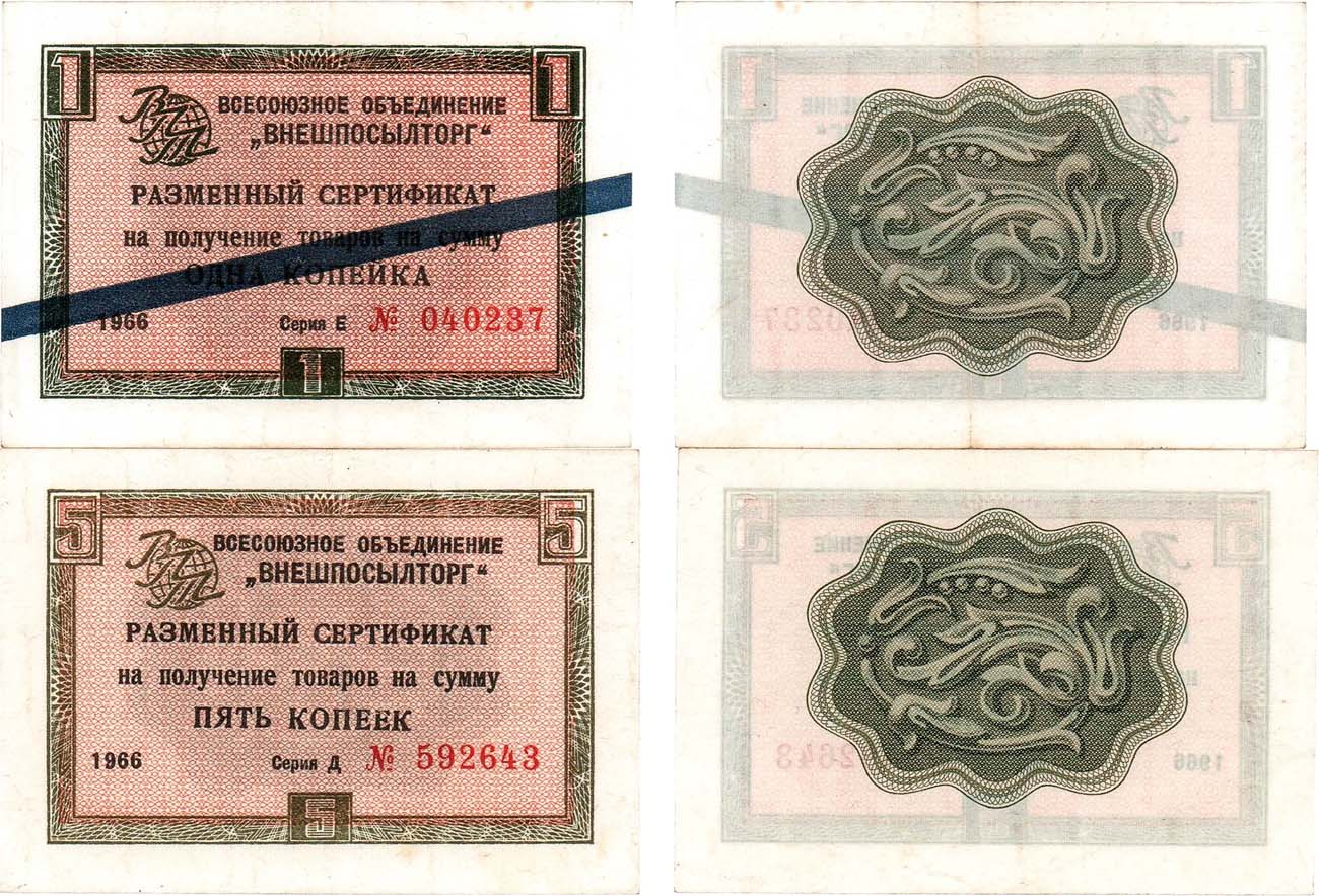 1 копейка 1966 года. Синяя горизонтальная полоса (соцстраны). Серия Е, №040237. Истомин 1.3.15. XF/aUNC. 5 копеек 1966 года. Без полосы. Серия А, №592643. Истомин 1.1.17. aUNC. XF/aUNC.