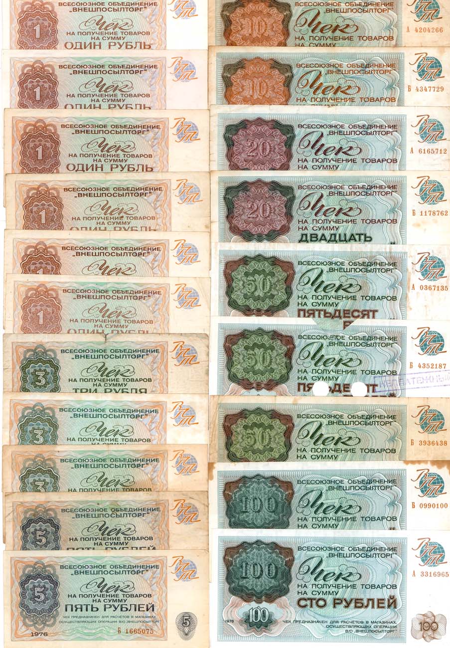 Чек на сумму 100 рублей 1976 года. Печать "Для денежных документов №38". Истомин 2.1.13. Чек на сумму 100 рублей 1976 года. Печать "Торговое объединение Внешпосылторг №11". Истомин 2.1.13. Чек на сумму 50 рублей 1976 года. Истомин 2.1.12. Чек на сумму 50 рублей 1976 года. Погашен. Печать "НЕПЛАТЕЖНЫЙ". Истомин 2.1.12. Чек на сумму 50 рублей 1976 года. Серия А. Истомин 2.1.12. Чек на сумму 20 рублей 1976 года. Серия А. Истомин 2.1.11. Чек на сумму 20 рублей 1976 года. Серия Б. Истомин 2.1.11. Чек на сумму 10 рублей 1976 года. Серия Б. Истомин 2.1.10. Чек на сумму 10 рублей 1976 года. Серия А. Истомин 2.1.10. Чек на сумму 5 рублей 1976 года. Серия Б. Истомин 2.1.9. Чек на сумму 5 рублей 1976 года. Серия А. Истомин 2.1.9. Чек на сумму 3 рубля 1976 года. Серия Б. Истомин 2.1.8. Чек на сумму 3 рубля 1976 года. Серия Б. Истомин 2.1.8. Чек на сумму 3 рубля 1976 года. Серия А. Истомин 2.1.8. Чек на сумму 1 рубль 1976 года. Серия Б. Истомин 2.1.7. Чек на сумму 1 рубль 1976 года. Серия Б. Истомин 2.1.7. Чек на сумму 1 рубль 1976 года. Серия А. Истомин 2.1.7. Чек на сумму 1 рубль 1976 года. Серия А. Истомин 2.1.7. Чек на сумму 1 рубль 1976 года. Серия В. Истомин 2.1.7. Чек на сумму 1 рубль 1976 года. Серия Г. Истомин 2.1.7. VF/AU.