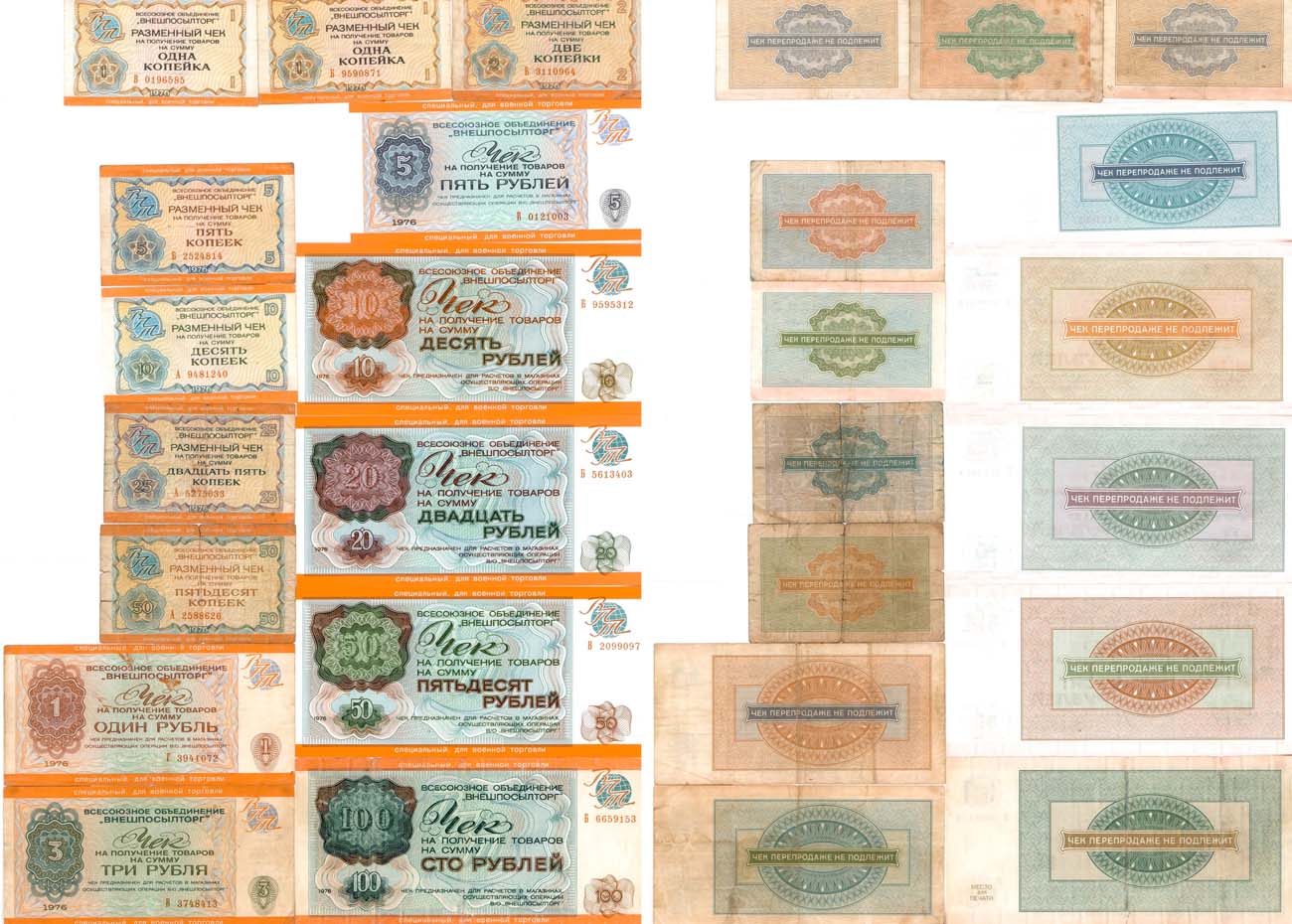 Чек на сумму 100 рублей 1976 года. Истомин 3.1.13. Pick M22. Чек на сумму 50 рублей 1976 года. Истомин 3.1.12. Pick M21. Чек на сумму 25 рублей 1976 года. Истомин 3.1.11. Pick M20. Чек на сумму 10 рублей 1976 года. Серия Б. Истомин 3.1.10. Pick M19. Чек на сумму 5 рублей 1976 года. Истомин 3.1.9. Pick M18. Чек на сумму 3 рубля 1976 года. Истомин 3.1.8. Pick M17. Чек на сумму 1 рубль 1976 года. Истомин 3.1.7. Pick M16. Разменный чек на сумму 50 копеек 1976 года. Истомин 3.1.6. Pick M15. Разменный чек на сумму 25 копеек 1976 года. Истомин 3.1.5. Pick M14. Разменный чек на сумму 10 копеек 1976 года. Истомин 3.1.4. Pick M13. Разменный чек на сумму 5 копеек 1976 года. Истомин 3.1.3. Pick M12. Разменный чек на сумму 2 копейки 1976 года. Истомин 3.1.2. Pick M11. Разменный чек на сумму 1 копейка 1976 года. Истомин 3.1.1. Pick M10. Разменный чек на сумму 1 копейка 1976 года. Истомин 3.1.1. Pick M10. VF/UNC.