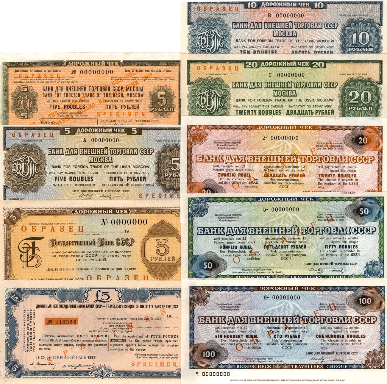 СССР. Дорожный чек на 5 фунтов 1957 года. SPECIMEN. Истомин 7.16.2. СССР. Дорожный чек на 5 рублей 1961 года. SPECIMEN. Истомин 7.5.1. СССР. Дорожный чек на 5 рублей 1980 года. SPECIMEN. Истомин 7.8.1. СССР. Дорожный чек на 5 рублей 1978 года. SPECIMEN. Истомин 7.13.1. СССР. Дорожный чек на 10 рублей 1978 года. SPECIMEN. Истомин 7.13.2. СССР. Дорожный чек на 20 рублей 1978 года. SPECIMEN. Истомин 7.13.3. СССР. Дорожный чек на 20 рублей выпуск (1987) "три языка" года. SPECIMEN. Истомин 7.14.2. СССР. Дорожный чек на 50 рублей выпуск (1987) "три языка" года. SPECIMEN. Истомин 7.14.3. СССР. Дорожный чек на 100 рублей выпуск (1987) "три языка" года. SPECIMEN. Истомин 7.14.4. XF/UNC.